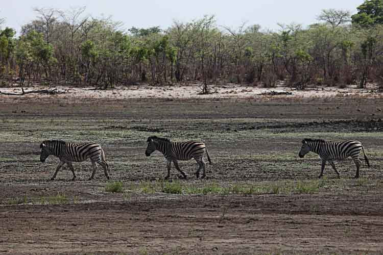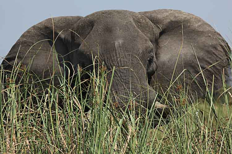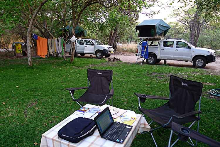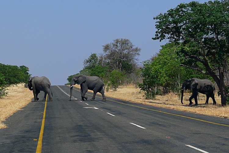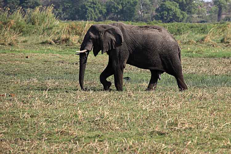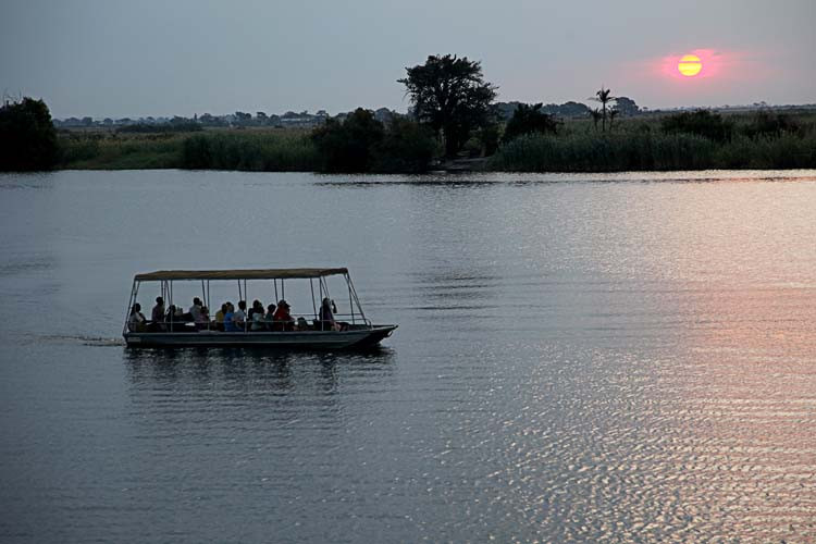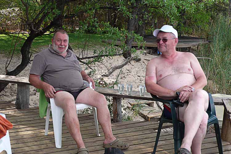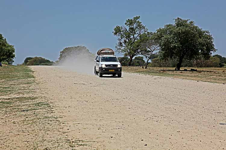 Unsere beiden Autoübersteller bitten uns, sie bis nach Kasane mitzunehmen. Nach 75 km sind wir an der Grenze zur Botswana, die beiden helfen uns sehr bei den Grenzformalitäten. Wir müssen um $10,- eine Autoversicherung abschließen, dann dürfen wir einreisen. In Kasane ist die Kwalape Lodge für uns reserviert, wir bekommen Lodges, die wie ein Haus gebaut sind, deren Wände aber aus Zeltstoff sind. Klimaanlage und ein riesiges Badezimmer stehen bereit. Am frühen Abend fahren wir mit den Zaunis in die Stadt von Kasane. Wir kaufen Wasservorräte in einem Supermarkt und wollen dann am Flussufer in einem Hotel essen gehen. Dort wird aber nur ein Menü um umgerechnet € 60,- geboten, das ist uns zu viel. Wir fahren zurück zur Lodge und nehmen ein Sandwich zu zweit.