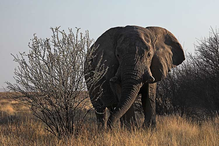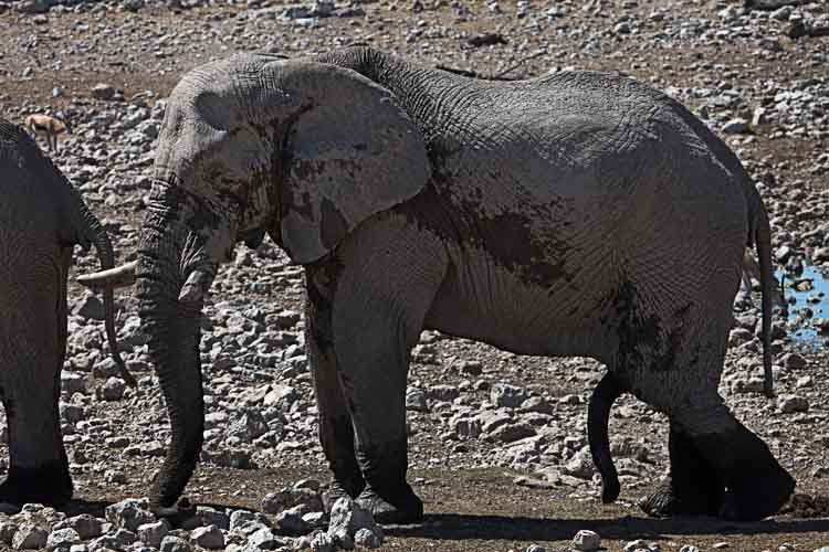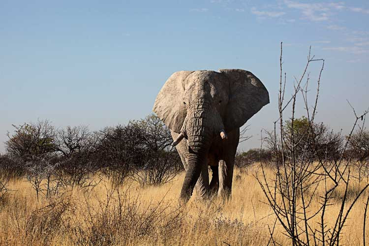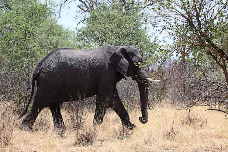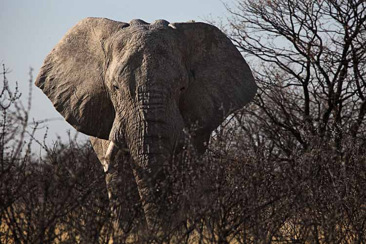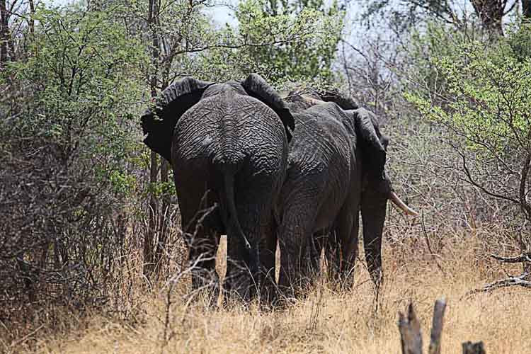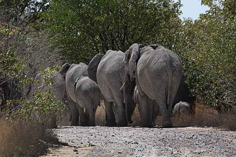 Außer dem „Löwenfutter“ können wir nichts sehen. Heute machen wir die große Westrunde vom Park fertig. Auf einem 4 WD Track kommt erstmals der Allradantrieb zum Einsatz. Jetzt sehen wir auch 3 Giraffen und einen Strauß. An einem künstlichen Wasserloch sitzen dann viele Geier, die bei unserem Näherkommen auf einen abgestorbenen Baum fliegen. Etwas weiter vorne sitzen bei einem Kudu-Kadaver eine Menge Marabus. Dann wird es abenteuerlich und wir schalten den Allradantrieb ein. Einer „schönen tiefen Sandpiste“ folgend sehen wir vorerst keine weiteren Tiere, hier ist das Land noch ziemlich trocken, ausgedörrt und verbrannt. Plötzlich stehen links wieder ein paar schöne Elefanten, deren Anblick wir natürlich wieder in voller Pracht genießen. Leider brechen sie immer wieder Bäume und Äste um, die sie auf dem Weg liegen lassen. Michi ist unsere Wegräumerin und zieht die Bäume zur Seite. Dabei zieht sie sich einen Akaziendorn in den Oberschenkel ein. Auf der Hauptstraße operiert sie sich diesen wieder heraus, aber ein kleines Stück mit einem Widerhaken bleibt unter der Haut. Das wird sie wahrscheinlich noch als Urlaubserinnerung mit nach Hause nehmen.
