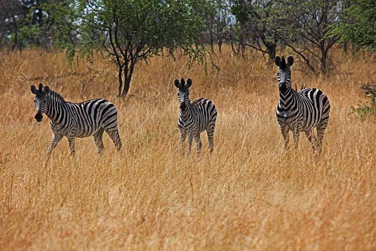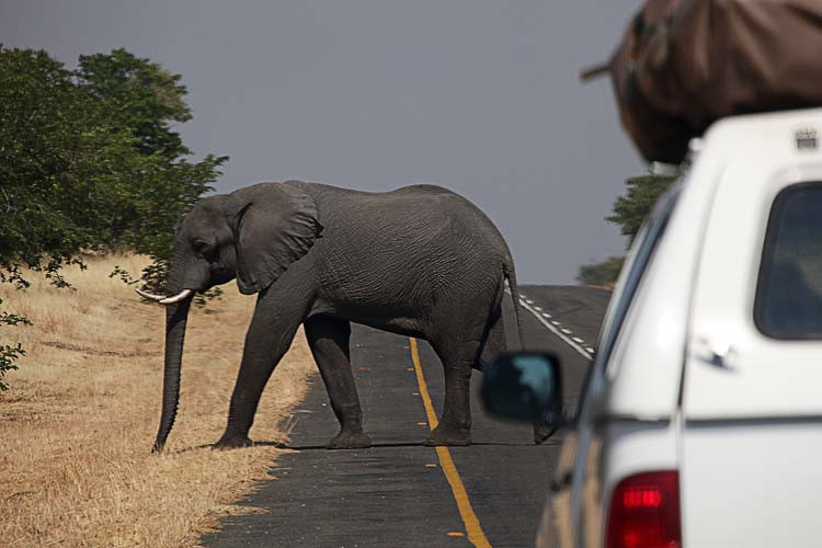 Tag 5, Montag, 15. 10. 2012 Um 08:00 Uhr Aufbruch und Einfahrt in den Chobe Nationalpark, dort müssen wir das Auto registrieren, dann dürfen wir auf der asphaltierten Hauptstraße durch den Nationalpark zum Grenzübergang nach Namibia fahren. Die Fahrt auf der unbefestigten Straße entlang des Grenzflusses hätte zur Vorbedingung gehabt, 2 Nächte im Nationalpark zu verbringen. Nachdem die Lodges sündteuer sind und von den Vermietern die Campingplätze im Voraus leergebucht werden (jetzt wissen wir auch warum), geben wir unser Erspartes lieber in Namibia aus. Unterwegs sehen wir eine Elefantenherde die Straße queren, eine Giraffe, ein Zebu und Zebras. Der Grenzübergang nach Namibia, nahe der Stadt Ngoma ist wesentlich einfacher, als nach Botswana.