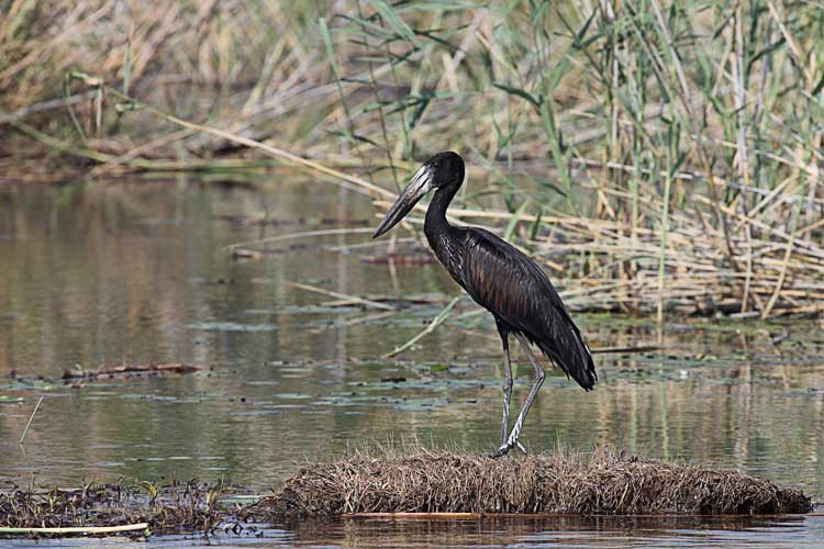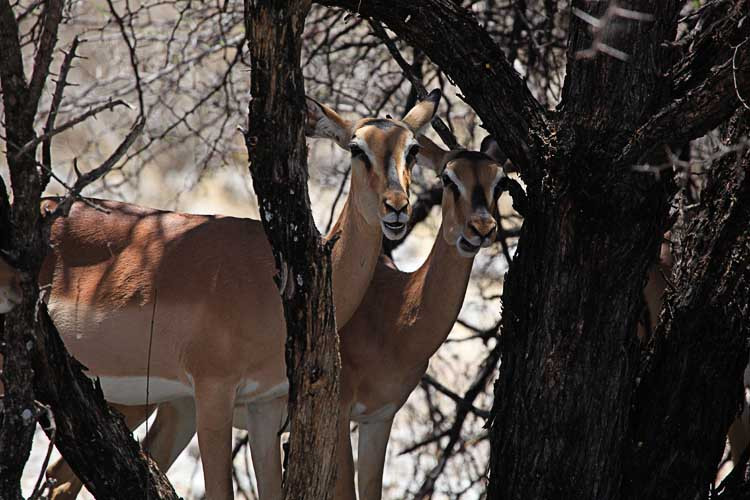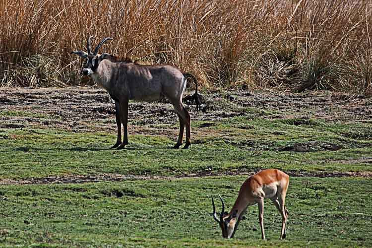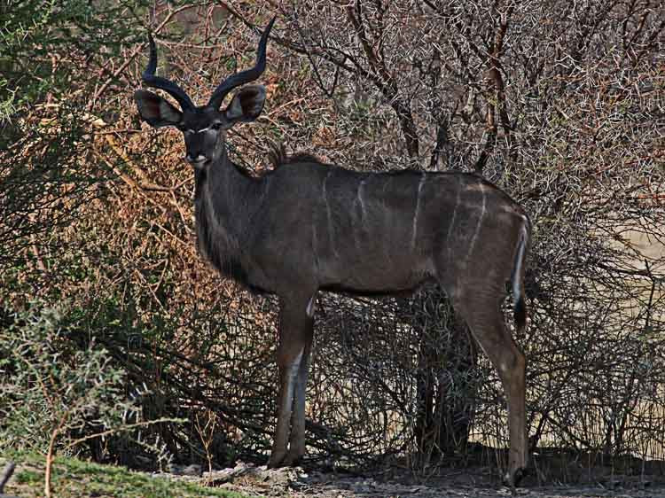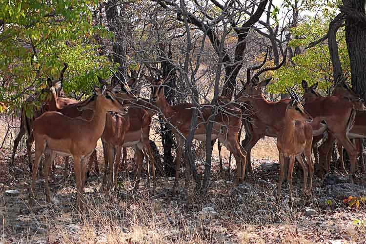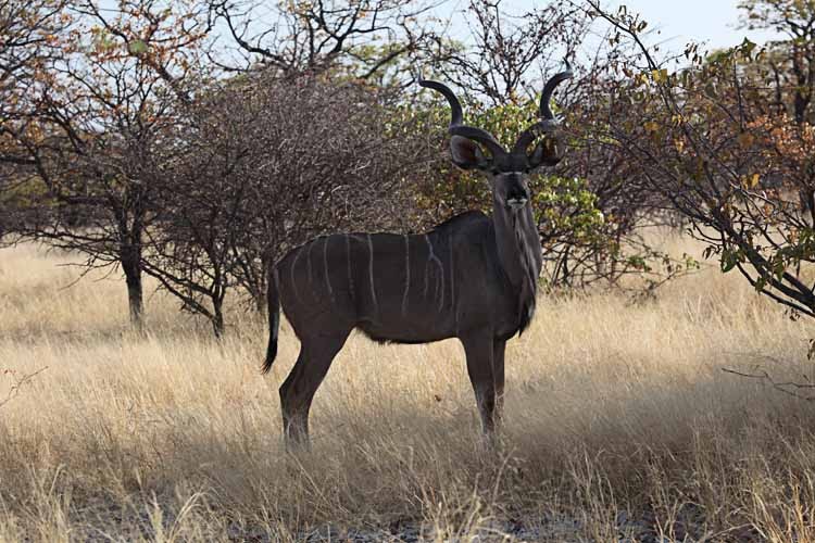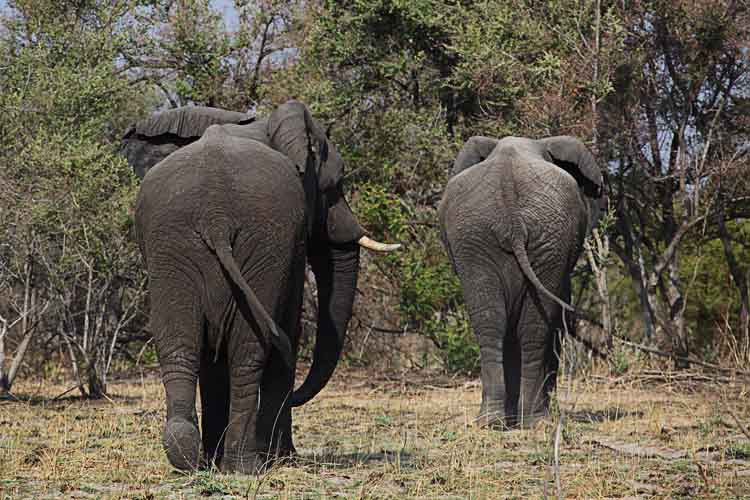 Tag 8, Donnerstag, 18.10.2012 Gegen 06.30 Uhr brechen wir unsere Zelte ab, um noch einmal in den Mabango Nationalpark zu fahren. Heute sehen wir sehr wenig Vierbeiner, vorerst nur ein paar Impalas, dann Kudus und dann doch noch Riedböcke. Ein paar freche kleinere Affen mit türkisen Penissen kommen neugierig an unsere Autos. Der Marabu sitzt noch in seinem Schlafbaum, wo wir ihn gestern gesehen haben und im Nebenbaum erblicken wir unseren ersten Seeadler.