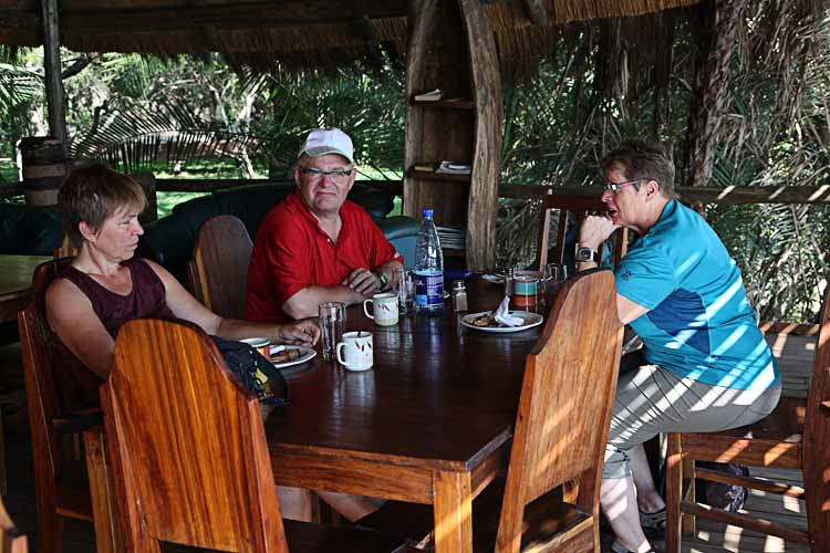 Anschließend stellt unser Guide noch einige mitgebrachte Geschenke vor das Auto, 2 Säcke mit Maismehl, Speiseöl und andere Lebensmittel. Gegen 11:30 Uhr kommen wir wieder zurück zum Hotel. Wir aalen uns am Pool, gegen 17:30 Uhr gehen wir den Bush Walk, viele Höhenmeter ohne Ereignisse. Am Abend essen wir wieder herrlich.