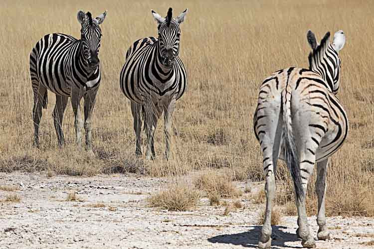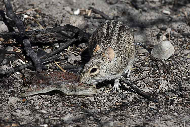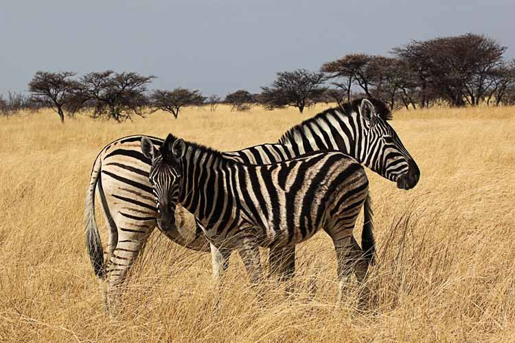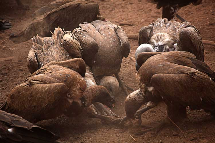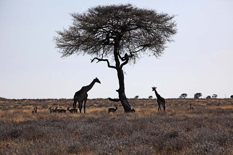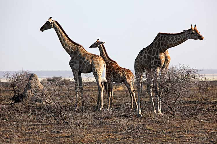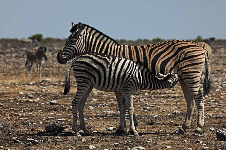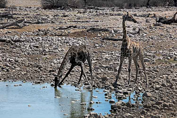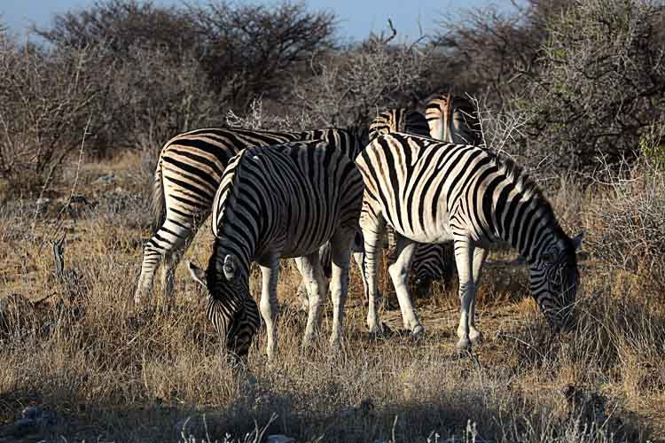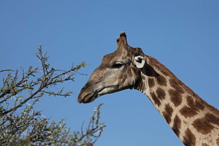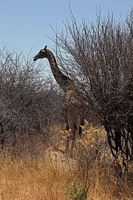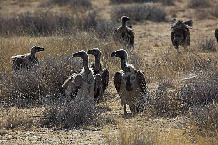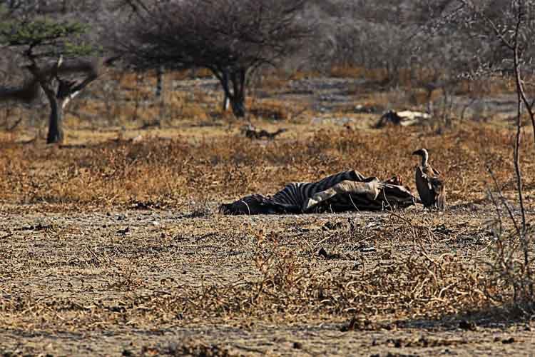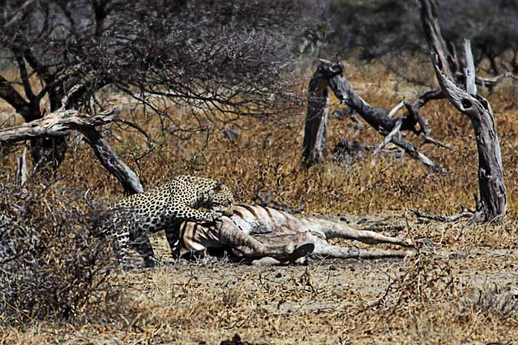 Auf dem Weg zum Camp Nomutoni sehen wir schon Giraffen. Auf dem Campingplatz stellen wir ein Auto fix ab und begeben uns mit einem Auto auf die Pirsch. Wir fahren den Tween Palmsweg und stoßen auch gleich auf ca. 30 Geier. Bei näherer Betrachtung sehen wir ein geschlagenes Zebra im Busch liegen. Es dauert nicht lange und schon fliegen die Geier hoch um einem Leoparden Platz zu machen. Er versucht das Zebra zu zerlegen, was ihm aber nicht gelingt. Schlussendlich überlässt er diese lästige Arbeit den Geiern und holt sich später was er will.