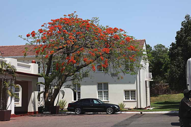 Tag 4, Sonntag, 14. 10. 2012 Frühstück bei Roland. Pünktlich kommen wie vereinbart die Autos um 09:00 Uhr zur Lodge. Bis 11:30 Uhr dauert die Fahrzeugübernahme, dann checken wir aus und fahren noch zum Victoriafalls Hotel, einem viktorianisch pompösen Kolonialbauwerk.