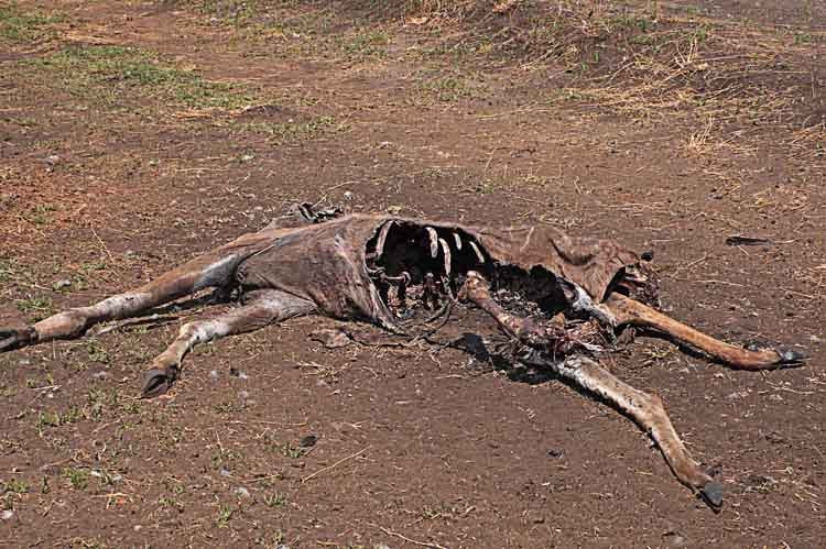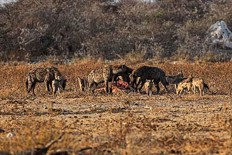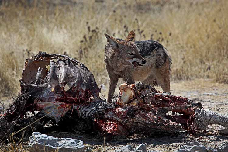 Auf dem Rückweg müssen wir natürlich die Fortschritte begutachten, die beim Zebra stattgefunden haben. Das Zebra liegt nicht mehr ganz an der selben Stelle, aber dafür kommt kurz darauf wieder der Leopard und legt sich in den Schatten eines Baumes um seine Beute zu bewachen. Rund um ihn schleichen sich 3 Schakale von einer Ecke in die andere, wagen es aber nicht, zu nahe zu kommen.