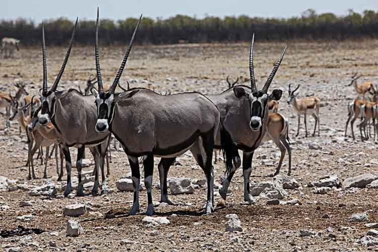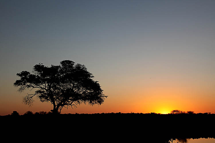 Wir beobachten die Tiere eine ganze Weile, müssen dann aber ins Camp zurück, um 19:00 Uhr werden die Tore geschlossen. Wir gehen Essen, nicht ohne vorher den tollen Sonnenuntergang zu genießen. Nach einem Menü aus 3 Gängen schauen wir noch einmal zum Wasserloch.