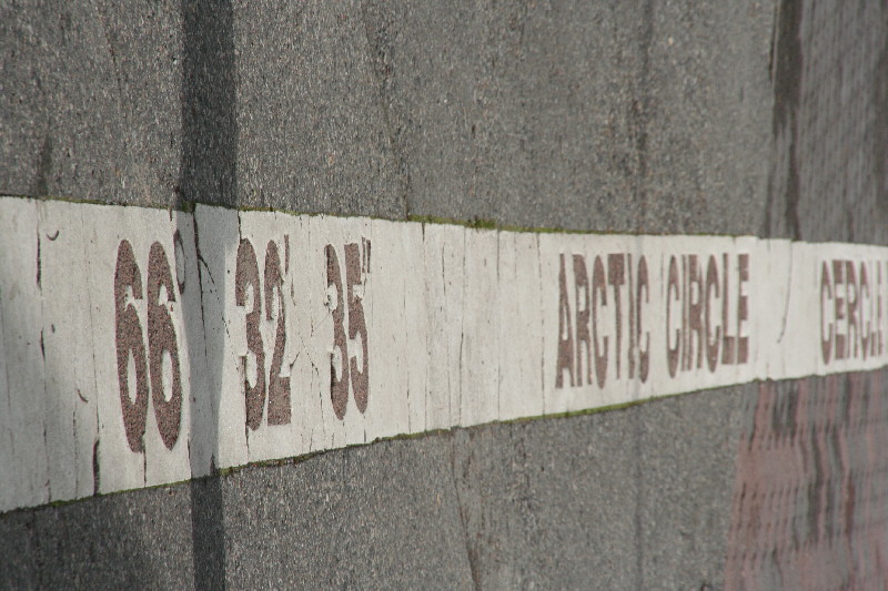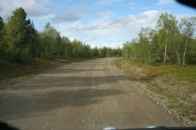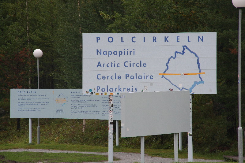 Hinter Jokkmokk überqueren wir zum zweiten Mal den Polarkreis, diesmal aber in südlicher Richtung. Dieser Übergang ist relativ schmucklos, lediglich ein paar weissgetünchte Findlinge markieren den Verlauf.