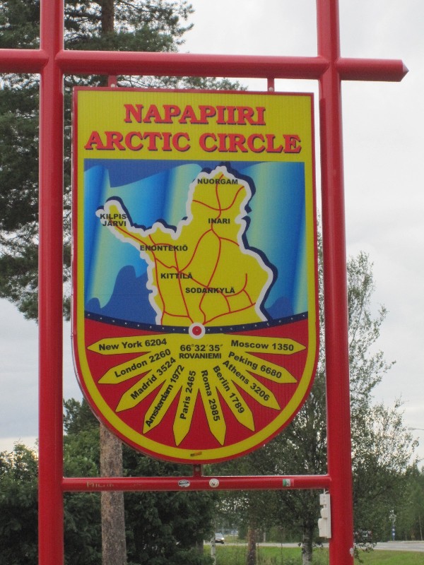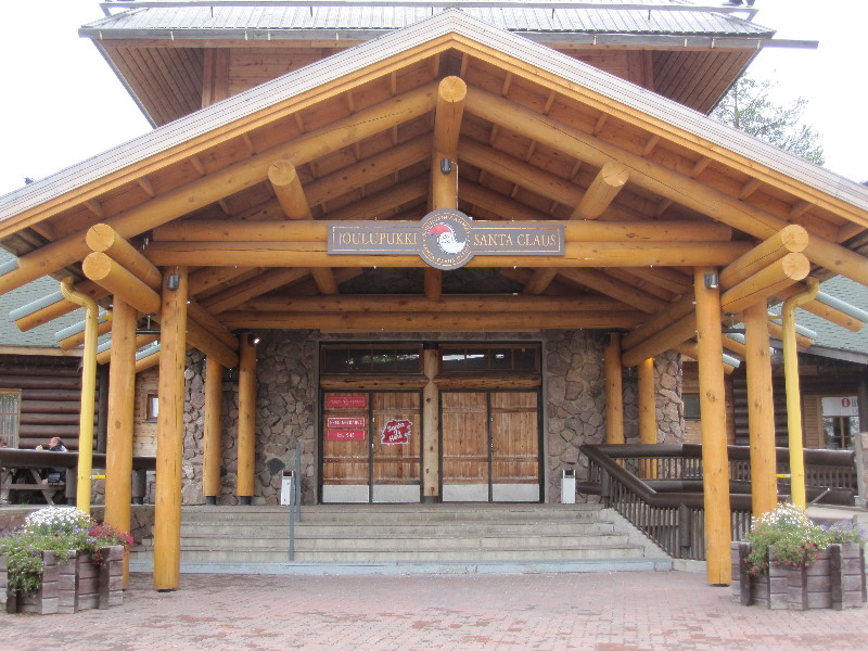 Wir erreichen nach rund 100 km bei so gut wie keinem Verkehr Rovaniemi. Als erstes sticht mir die Skisprungschanze ins Auge, die ich noch von einem Ausflug mit meinen Staffelkameraden vom DTM-Rennen in Helsinki kenne und an deren Fuß wir damals übernachtet haben. Heute jedoch kaufen wir bei Lidl noch was ein und vespern auf dem Parkplatz, bevor wir zum Santa-Claus-Village am Polarkreis fahren.