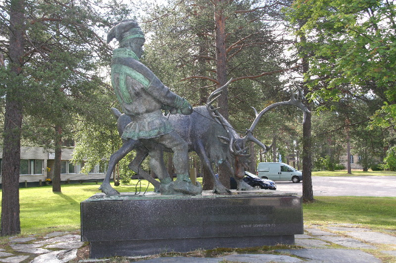 Wir durchqueren die Sennalandet-Hochebene. Rentierherden und einzelne Lappenansiedlungen bevölkern diese baumlose Landschaft. Die Strasse verläuft fast schnurgerade, sie wird nur von parallel verlaufenden Zäunen begleitet. Das im Reiseführer angekündigte Lappendorf Aisaroaivi ist leider verlassen. Es gibt nur rechts der Strasse die Samenkapelle als Fotomotiv.