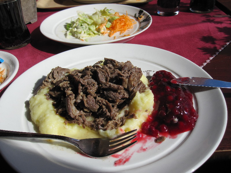 Wir versuchen unser Glück selbst beim Goldwaschen, holen uns jedoch nur kalte nasse Hände. Wieder ein Traum geplatzt. Wir geben auf und fahren weiter. Bei Kaunispää verlassen wir die E75 und fahren noch ins Skigebiet und gönnen uns im Berggasthof mit herrlicher Aussicht das landestypische Rentiergeschnetzelte.