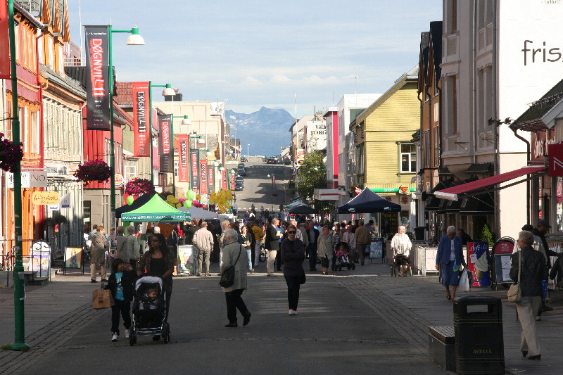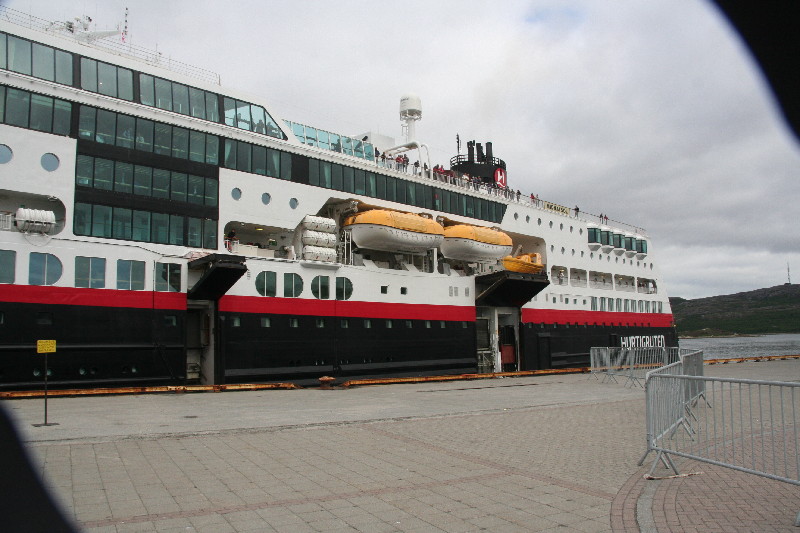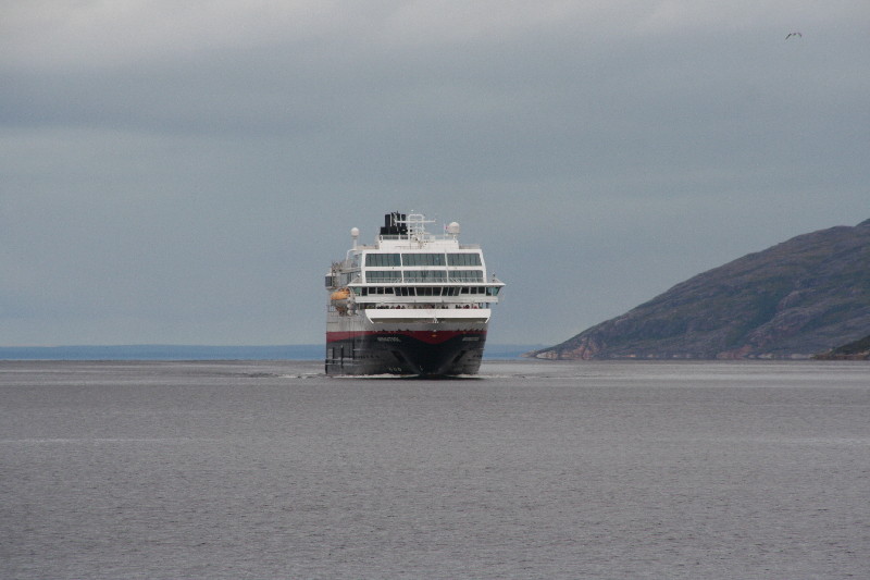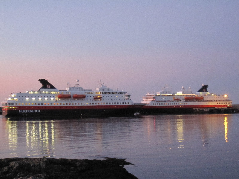 Tag 6 – Samstag, 13.08.2011 Was für eine Nacht. Kurz nach 2 Uhr viele laute Stimmen am Wohnmobil. Also raus aus dem Bett und nachschauen. Cirka 50 Jugendliche warten auf irgendwas und reden lauthals durcheinander. Um 2.30 Uhr fährt ein Reisebus vor, alle steigen ein und es ist Ruhe. Aber nicht lange. Gerade wieder eingeschlafen – lautes Geschrei. Eine Möwe hat sich unser Wohnmobildach ausgesucht und schreit fürchterlich an der geöffneten Dachluke. Erst das Ausfahren der Sat-Schüssel kann sie vertreiben. Früh am Morgen fahren wir etwas unausgeschlafen zum Hurtigrutenkai, denn bald soll ein Schiff einlaufen. Um 9.30 Uhr kommt sie, die „Mitnatsol“ steuert den Kai an und entlässt hunderte Passagiere.