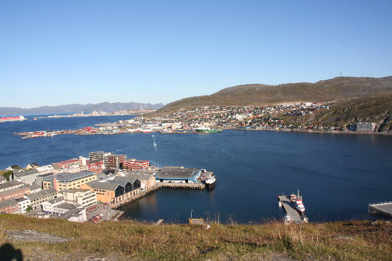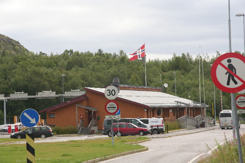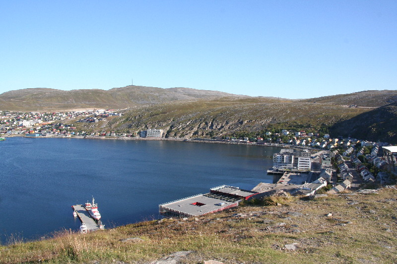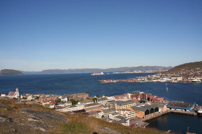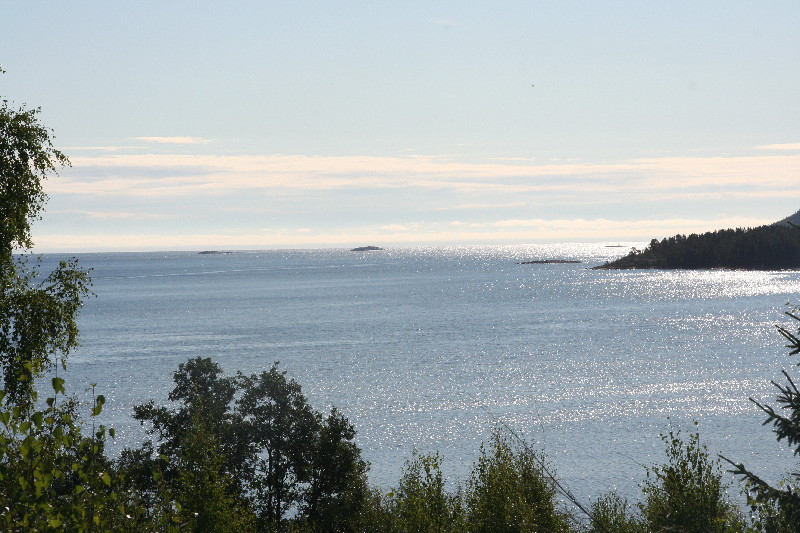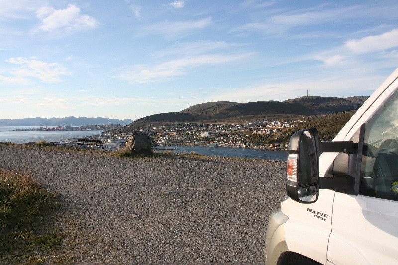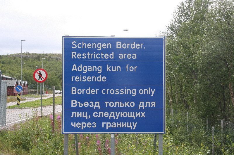 Ein ständiger Wechsel von Wald und Seen begleitet uns seit Stunden, bis wir endlich die Grenze nach Norwegen erreichen. Wir wollen unseren Alk-Vorrat an der Grenzstation anmelden, aber weit und breit kein Zoll. Erst einige km später kommt eine Zollstation, hier verwirklichen wir dieses Vorhaben. 50 km später laufen wir in Kirkenes ein und finden im Hafen einen Stellplatz hinter dem Polizeigebäude, auf dem wir uns für die Nacht niederlassen.