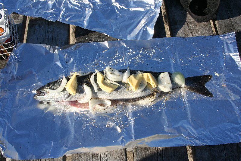 Ich kann endlich mein Vorhaben, zu Angeln, in die Tat umsetzen. Und siehe da, ziemlich schnell zappelt unser Abendessen am Haken.