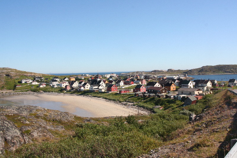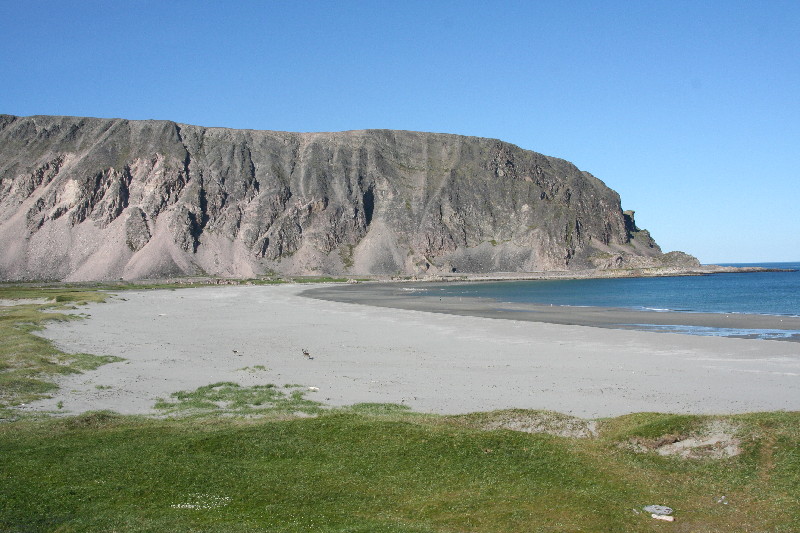 Nach 31 km stehen wir in Batsfjord, wo die Strasse wieder mal endet, weil danach nur noch der Nordpol kommen würde. Wir setzen uns vor eine Bäckerei und legen eine Kaffeepause ein, bevor wir zurück nach Gednje und weiter nach Berlevag fahren. Die Strasse windet sich um den Kongsoyfjorden, dessen Wasser türkisfarben leuchtet. Immer wieder taucht eine kleine Bucht mit einem herrlichen Sandstrand auf.