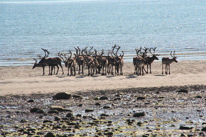 Die Strasse führt immer am Ufer der Varanger-Fjord entlang. Herrliche Sandstrände laden zum Baden ein, aber kein Mensch weit und breit zu sehen, lediglich Rentiere lecken das Salz vom Strand.