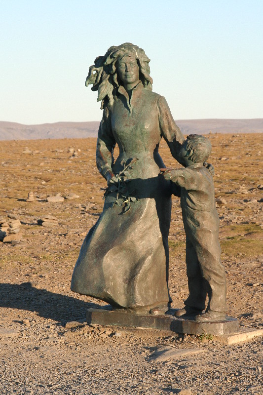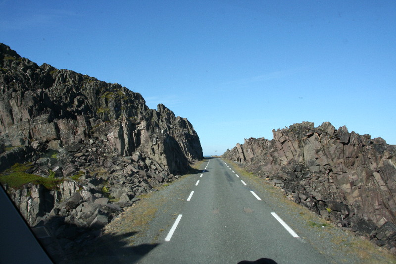 Hier scheinen lediglich Schafe und Rentiere heimisch zu sein. 28 km nur auf einer 3 m breiten Strasse durch eine bizarre Steinwüste, auf der einen Seite das Eismeer, auf der anderen Seite schroffe Felswände mit Schneefeldern.