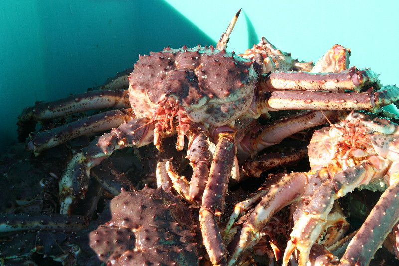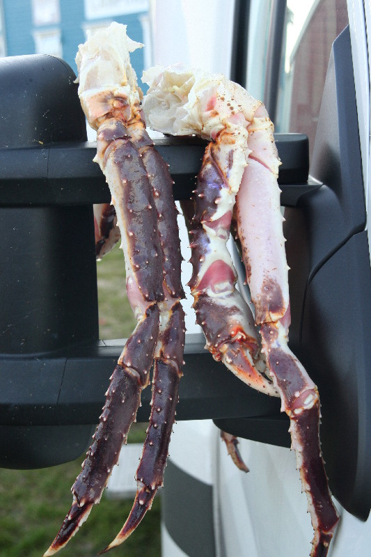 Wir durchstöbern den Ort und beobachten gespannt, wie am Hafen große Bottiche mit dem heutigen Fang von Königskrabben von einem Schiff gelöscht werden. Ganz schön groß die Dinger.