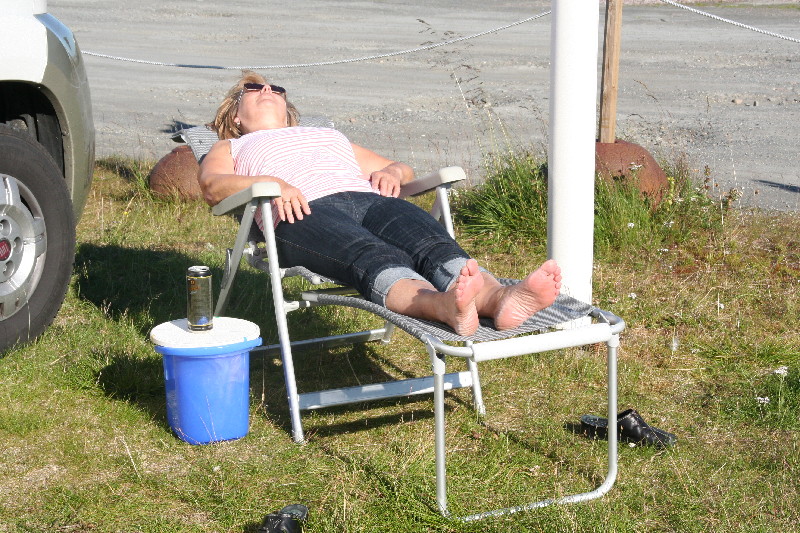 Nach dem Frühstück muss erst mal entsorgt und der Wassertanks neu befüllt werden. Wir fahren dieselbe Strecke, die wir gestern gekommen sind, wieder zurück. Am ersten Sandstrand ein Zwischenstopp. Badehose und Handtuch raus und runter zum Wasser. Schon während der Reiseplanung hab ich mir vorgenommen, einmal im Eismeer zu baden, weil dies zu einem echten Nordlandfahrer dazugehört. Jetzt ist es soweit. Bei momentan 10 ° ist die Wassertemperatur kaum noch in cm zu messen, also es war saukalt.