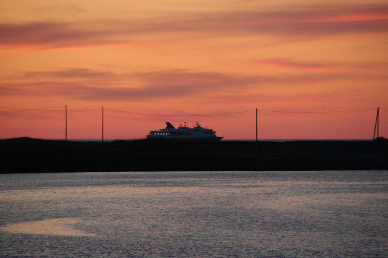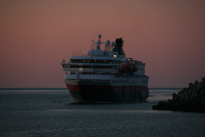 Um 22.00 Uhr steuert das südwärtsfahrende Hurtigruten-Schiff die Hafeneinfahrt an und macht durch lautes Hupen auf sich aufmerksam.