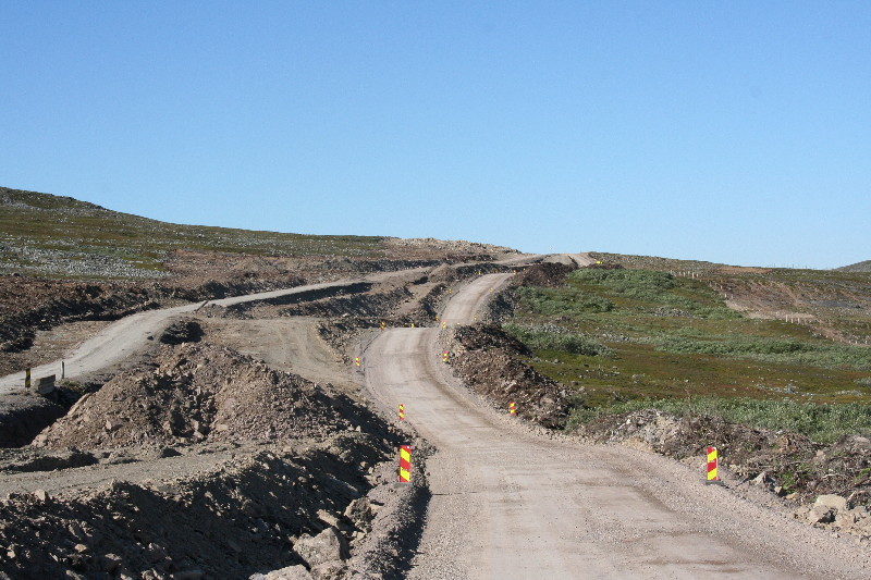 In Tana bru wechseln wir auf die andere Flussseite und durchqueren das Ifjordfjellet. Völlig überraschend kommt eine Strassenbaustelle, wobei Baustelle maßlos untertrieben ist. Festgewalzte Felsbrocken mit Dreck und Schotter aufgefüllt zwingen zu langsamster Fahrt über viele km.