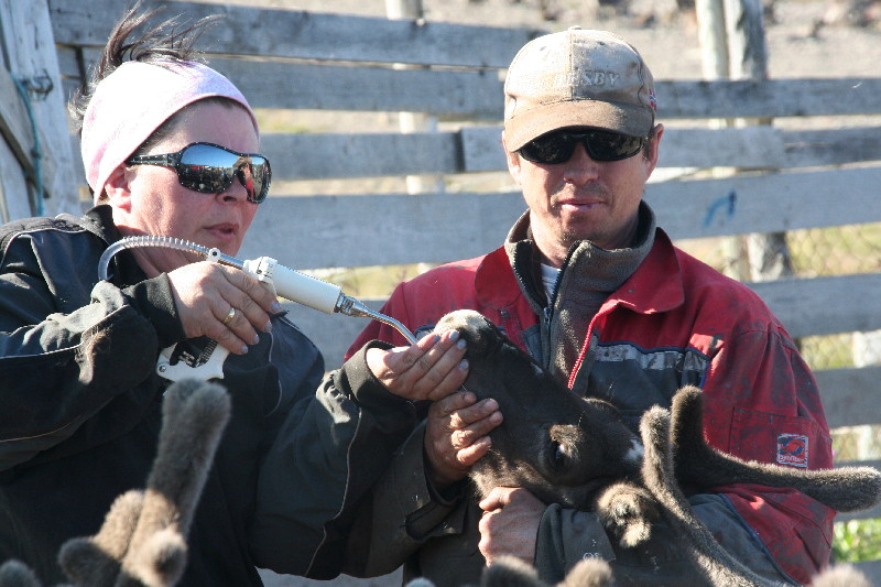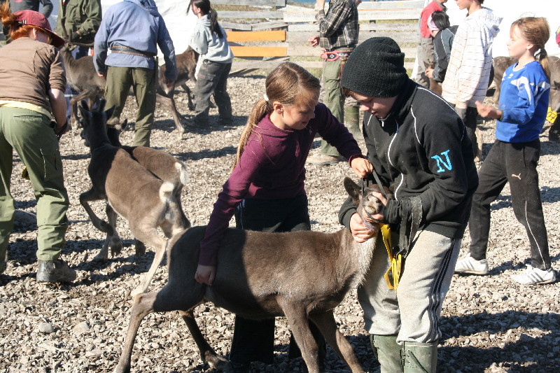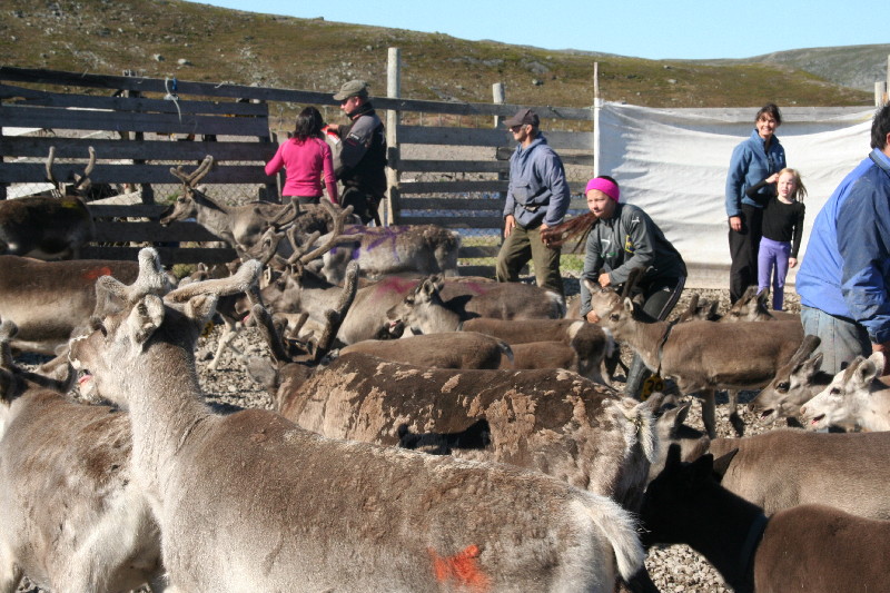 Kaum haben wir wieder Asphalt unter den Rädern, werden wir mit einem weiteren highlight entschädigt. Am Strassenrand sind große Gatter aufgebaut, in denen Rentiere auf ihre Sortierung warten. Immer wieder wird ein Teil von ihnen in ein rundes Gatter getrieben. Dort warten bereits die Hirten um die Tiere festzuhalten, zu markieren, zu impfen. Selbst die Kinder helfen mit, indem sie den dieses Jahr geborenen Kälbern Schilder mit Nummern umhängen.
