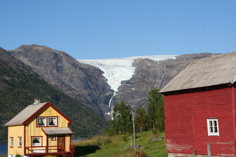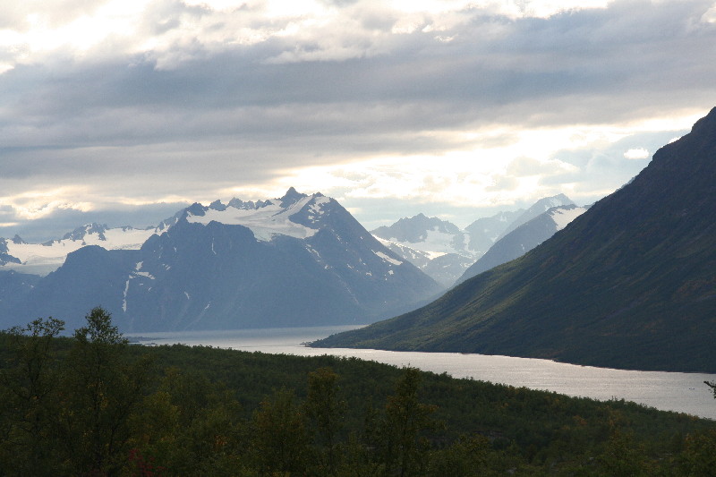 Ein ganzes Stück hinter Alta machen wir einen Abstecher zum Wanderparkplatz am Öksfjordbre, einem sehr beeindruckenden Gletscher, der angeblich als einziger norwegischer Gletscher direkt ins Meer kalbt. Mit einer 7 km langen Wanderung könnte man bis an die Gletscherzunge wandern, aber uns fehlt die Zeit dazu, da wir heute noch bis Tromsö wollen.