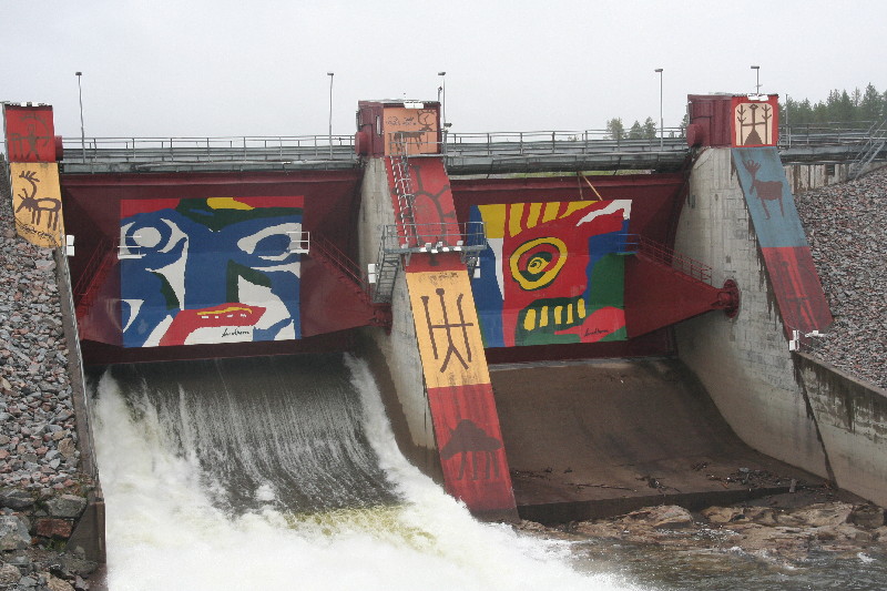 Jetzt wird ein „Konstverk“ mit Schildern an der Strasse angekündigt. Es handelt sich um ein Wasserkraftwerk am Lilla Lule Älv, das mit samischen Sinnbildern verschönert wurde.