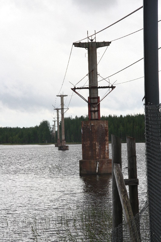 Auf Nebenstrecken fahren wir weiter, wir geniessen diese herrliche Waldlandschaft trotz des zwischenzeitlich eingesetzten Dauerregens. Wir sehen einen Wegweiser zur „Linbana“. Wir biegen ab, ohne zu wissen, was uns erwartet. Nach 3 km sehen wir die Masten einer Seilbahn, mit der früher goldhaltiges Gestein über 96 km transportiert wurde. Damit war sie die längste Seilbahn der Welt.