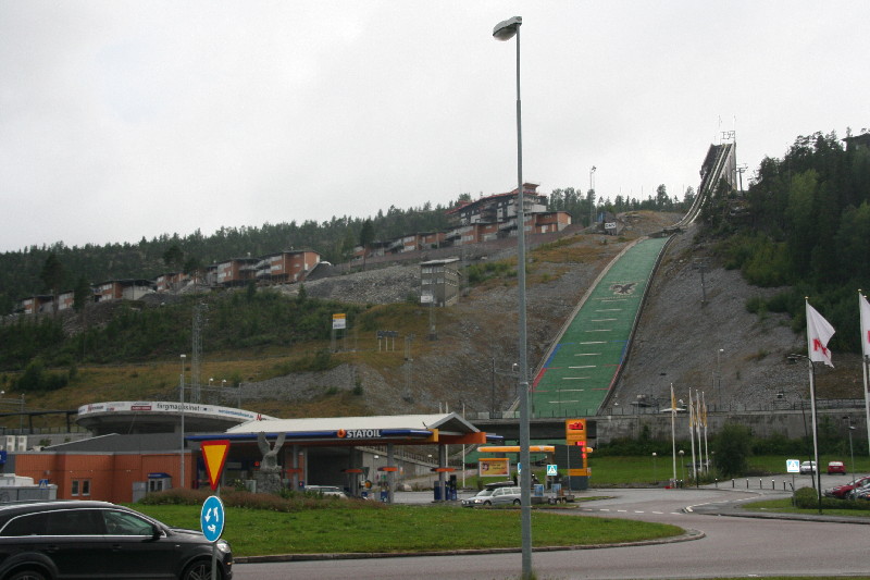 In Örnsköldsvik (Sitz von Fjällräven) entdecken wir mitten in der Stadt am großen Kreisverkehr eine Skisprungschanze, deren Auslauf unter der Schnellbahn hindurchgeht und über dem Dach der Tankstelle endet.