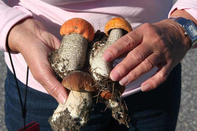 Plötzlich Vollbremsung. Da steht ein Riesenpilz am Strassenrand, der ein Essbarer sein könnte. Leider ist dieser schon zu alt und voller Maden, aber in seiner unmittelbaren Nähe stehen noch genug junge Exemplare. Mehrmals „fangen“ wir vom Womo aus noch solche Birkenpilze oder sind es Rotkappen? Egal, es wird unser Abendessen werden.