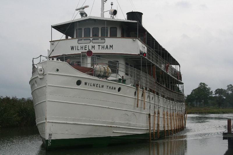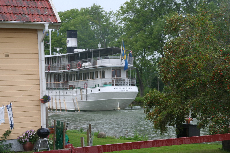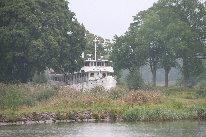 Wir fahren so am Kanal entlang und nach einigen Kilometern sehen wir sie, die „Wilhelm Tham“, eines von 2 Passagierschiffen auf dem Kanal. Sie wurde 1912 in Motala gebaut und erst 1965 wurde der Dampfkessel durch einen Dieselmotor ersetzt. Sie bietet Platz für 50 Passagiere. Das Schwesternschiff, die „Juno“ ist noch älter, sie wurde 1874 ebenfalls in Motala gebaut.