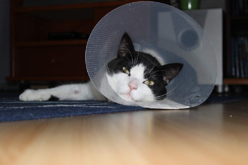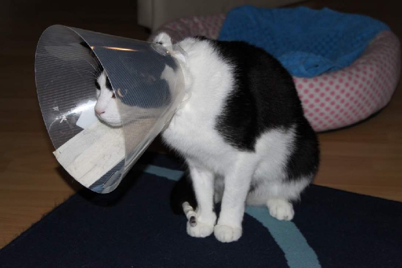 Wir haben damals, nachdem unsere Katze nur noch rückwärts lief, Erbarmen gehabt, den Trichter abgebaut und ihr ein festen Adhäsionsverband angelegt.