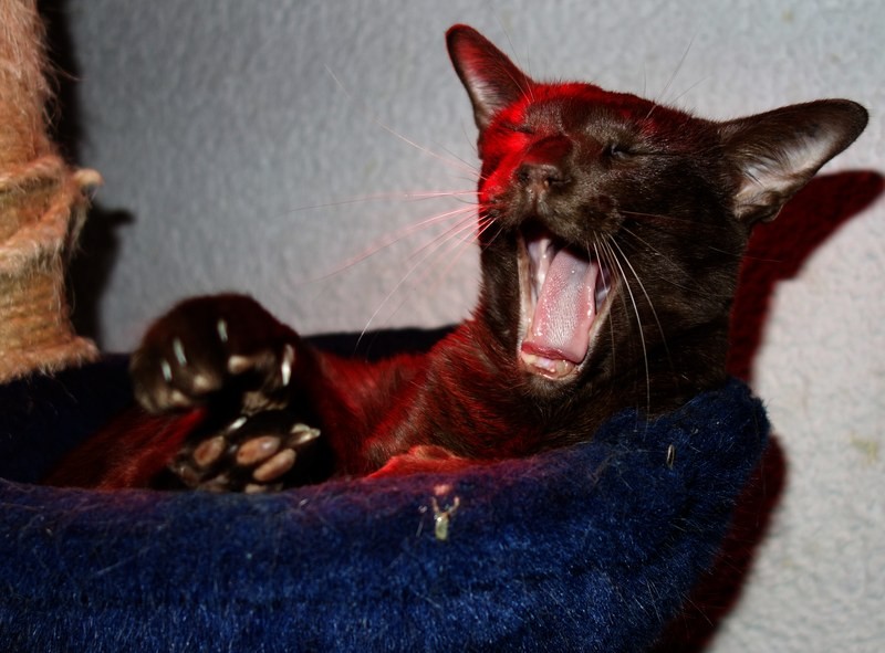 Dafür ist dieses Bild ganz aktuell: Jenny auch ganz müde vom KAter-Terror. Das rote Licht ist eine Wärmelampe.