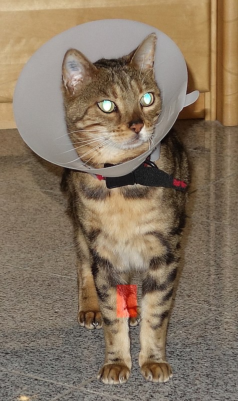 Der Tierarzt sagte, er darrf ohne Krause sein, wenn er nicht leckt. Also Krause weg und raus gelassen. Zuerst schaute er mich völlig erstaunt an, dann ...Wusch, weg war er. Als er zurück kam, hat die Wunde /schöner verschorft, leiht geblutet. Also Krause wieder dran und Ausgehverbot. Natürich versteht er es nicht und ist stinksauer. So sauer, dass er an der Katzenklappe rum gebissen hat wie ein Verrückter. Seit 20 Minuten ist er wieder ohne Krause und unter verschärfter Beobachtung.