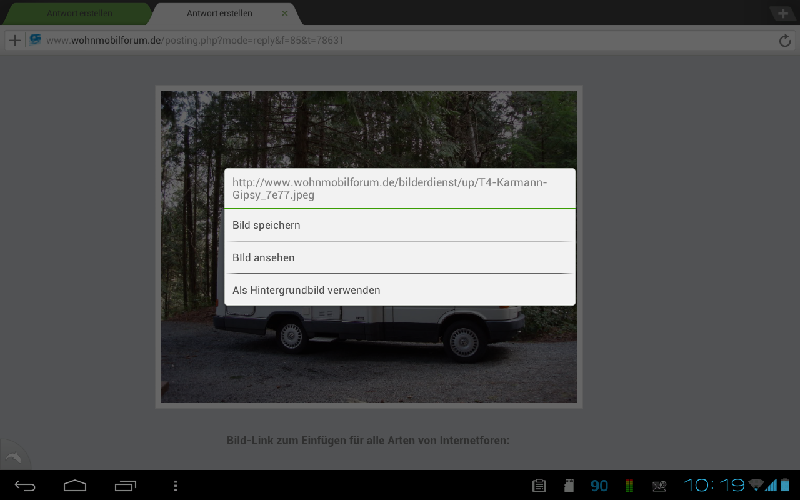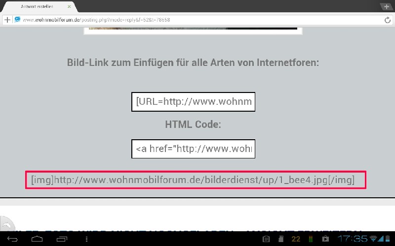 Hallo Annette, komisch, beim Zitieren ist dein Bild da, was da wohl schiefgelaufen ist! Hilfe, ich brauche mal bitte wieder Hilfe. Ich kenne nun inzwischen alle Schritte, um ein Foto von meinem Android Tablet hochzuladen und ins Forum zu stellen. Ich habe es mehrmals erfolgreich gemacht. Leider funktioniert es nun wieder nicht, ich mache jeden Anwendungsschritt wie immer. Beispiel [URL=http://www.wohnmob Es fehlt der HTML Code, mehr erscheint nicht. Was mach ich falsch? Bitte mit um eine einfache, verständliche Erklärung.Vielleicht kann jemand helfen? Kopierst du denn das hier markierte auch? Nur das funktioniert am Tablet. Das im Textfeld geht nicht. ![]() Hallo Jörg, genau diese Zeile erscheint bei mir neuerdings nicht mehr nach dem Hochladen. Es wird nur noch bis Url= http im oberen Feld angezeigt, alles andere erscheint nicht mehr. Du hast mir ja schon einmal alles ausführlich erklärt, es funktionierte auch bisher, aber nun bin ich ratlos. Hatte ich dich schon nach deinem Browser gefragt? @ ja, du hast mir den Dolphin Browser empfohlen, den ich auch instaliert habe. Den nutze ich auch und es geht bei mir. Hhhmmmm. Nimm mal den hier --> Link und versuch es noch mal und berichte dann. Was mir noch einfällt. Nutzt du die mobile Version des Browsers oder die Desktop Version? Vielleicht liegt es daran? @Jörg Die Einstellung steht auf Android Standard