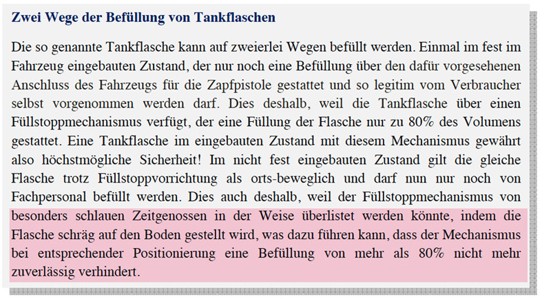 Wenn dies neben Anderen die Definition für einen Gastank ist, dann kann eine Gastankflasche nicht in einen Gastank umgewidmet werden, weil wesentliche Voraussetzungen nicht erfüllt sind. Du schreibst ja auch, dass eine Tankflasche diese Bedingungen nicht erfüllen kann. Folglich kann die obige Formulierung nicht stimmen. Da ich nicht vom Fach bin, verstehe ich diese Formulierung nicht.