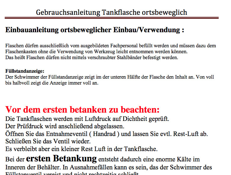 Eine solche Flasche darf an einer deutschen Gastankstelle prinzipiell nicht befüllt werden auch nicht vom Tankstellenpersonal. Hierzu gibt es eine Information: --> Link Dort den Artikel "Verbot des Betankens von ortsbeweglichen Druckgasbehältern (Betankbare Gasflaschen) / Hinweise für Tankstellenbetreiber" herunterladen. Scout Stimmt im Grundsatz, denn die Tankflasche ist ein Zwitter zwischen Flasche und Tank. Solange die Tankflasche nicht fest verschraubt ist, fällt sie wie eine Gasflasche unter Ladung. Sobald die Tankflasche aber fest mit dem Fahrzeug verbunden ist, wird die Tankflasche zu einem fest eingebauten Gastank. Neben den zitierten Vorschriften gibt es noch eine Vielzahl von weiteren Bau- und Betriebsvorschriften. Neben der ECE R67.01 in Verbindung mit der ECE R110 und einigen DIN-Normen gibt es noch ein Merkblatt zur Befestigung von Gastanks in Kraftfahrzeugen. Und genau hier kommt ein Problem ins Spiel. Ein Gastank muss so befestigt sein, dass in Längsrichtung die Gastankbefestigung 20g und in Querrichtung 8g aufnehmen können muss. Das ist in einem Flaschenkasten, der in der Regel aus Holz gebaut ist, nicht zu erreichen. Die Tankflasche müsste mit dem Fahrzeugrahmen oder einer entsprechenden Hilfrahmenkontruktion befestigt werden, damit diese Bedingung auch nur annähernd erreicht werden kann. Die Hersteller der Tankflaschen sind im Arbeitskreis Flüssiggas auf diesen Umstand hingewiesen worden. Das ist dann auch der Grund, warum bei Alugas die Bedienungsanleitung nur noch der "losen" Einbau und das Füllen nur durch Fachpersonal aufgeführt wird. Also, kann man Gastankflaschen vergessen. Zuviel Aufwand für ein wenig Luxus. Sinnvoller, der Einbau eines Gastanks. Prinzipiell ist Gas gefährlich und die Versicherung immer auf der sicheren Seite. Zur Zeit wird alles so überarbeitet das fast alle Schäden ausgeschlossen werden. Das nennt man Risikominimierung. Zu Gunsten der Versicherung natürlich. Dazu kommt ein Wust von Verordnungen, Gesetzen und dazu gehörenden Erläuterungen. Die Flaschen und Gastankverkäufer sehen das aber locker, die haften ja auch nicht. Die Hersteller denken da auch nicht drüber nach. Letztlich bleibt es bei denjenigen hängen die Mut haben. maredo Mit dieser Formulierung habe ich Probleme. Du schreibst als Beispiel: