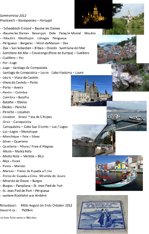 Hallole, hier ein Kurzbericht mit Bildchen unserer Sommerreise 2012: ![]() Stegi Super Bericht! Macht Laune und lass Freizeit regnen! Klaus Schöne Tour - ich hätte auch gerne einen ausführlicheren Bericht angesehen.. :wink: Schöne Mischa Danke für die interessante Reiseroute, ich hätte auch gern mehr darüber gelesen. Wir planen eine ähnliche Reise, waren 2 Monate ausreichend oder eher knapp? Ende April wird es bei uns hoffentlich losgehen, ich bin schon so gespannt. LGElfie Hallole bonjourelfie, hallole liebe "Fories", wir werden in 2014 wieder nach Portugal reisen, um uns besonders im Grenzgebiet zu Spanien aufzuhalten. Außerdem gibt es noch viel zu sehen, Lissabon steht dann aber auch wieder auf dem Zielplan, Porto eher nicht mehr. Wir finden, wir hatten ausreichend Zeit, man kann aber leicht noch einige Wochen dran hängen. Da ich anderweitig sehr aktiv bin - Erstellen von vertonten Diavorträgen als Reiseberichte - schrieb ich hier wenig, wollte aber gerne die Forumsmitglieder über unsere Reiseroute unterrichten. Gute Reise wünscht Stegi |