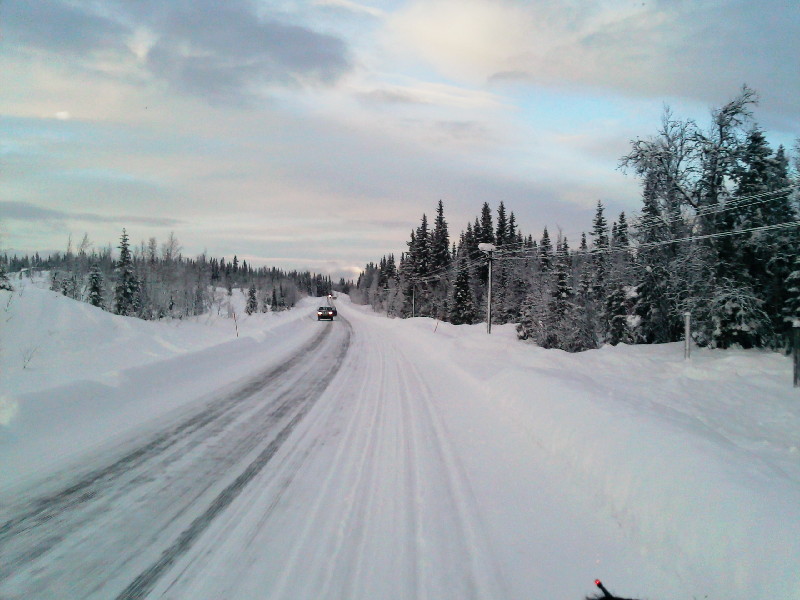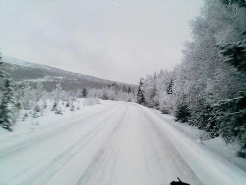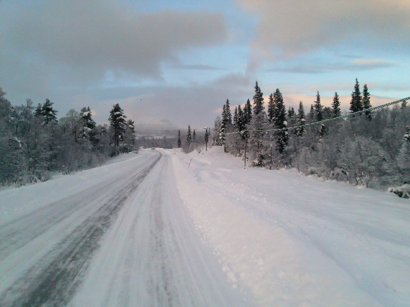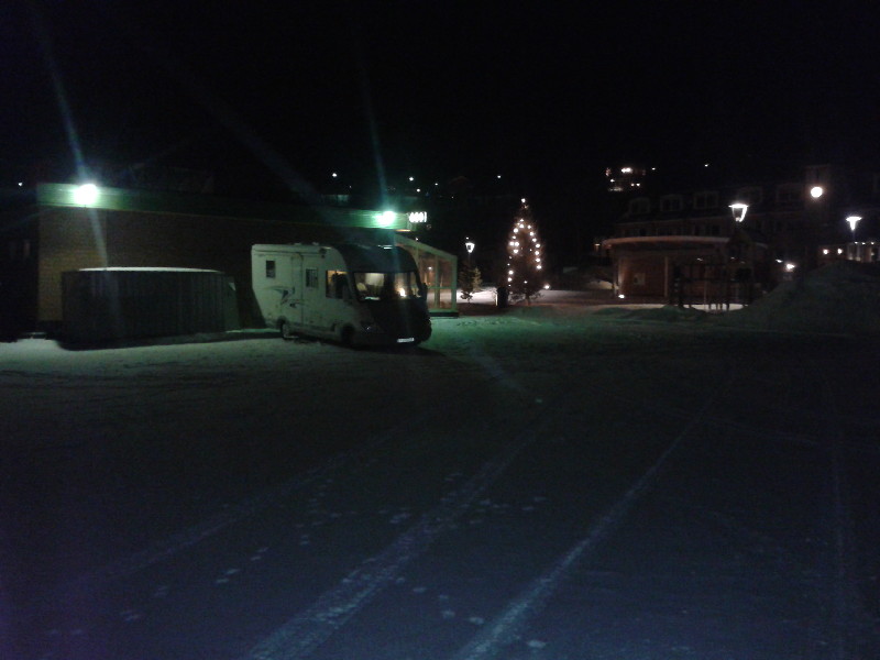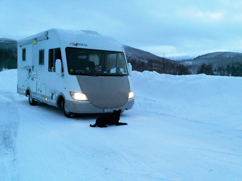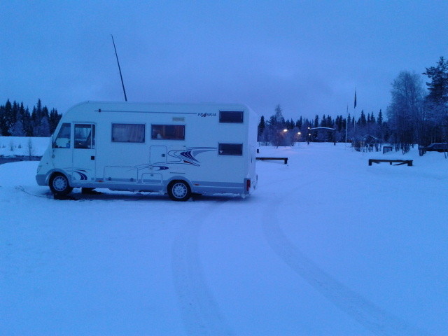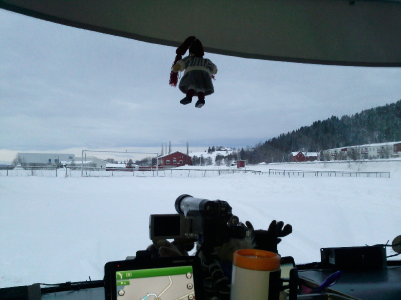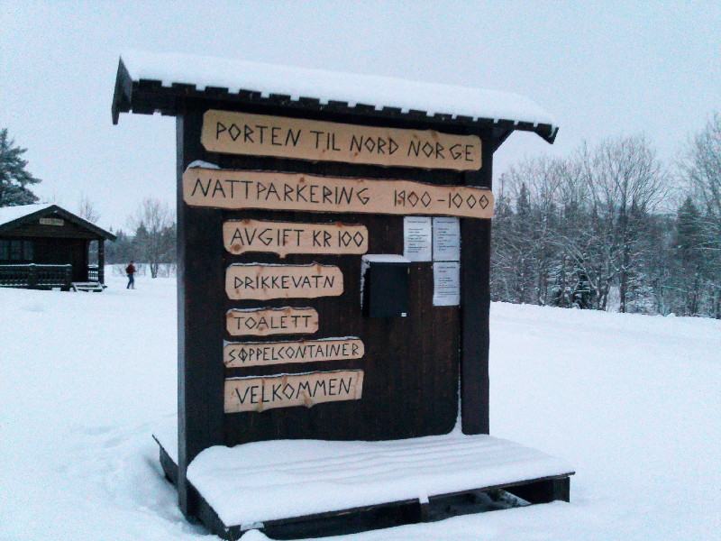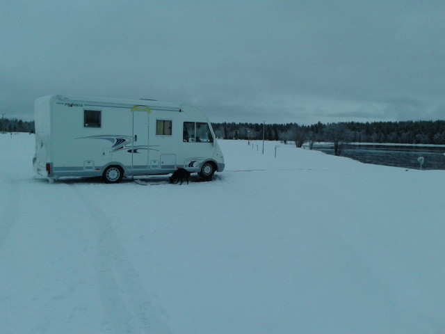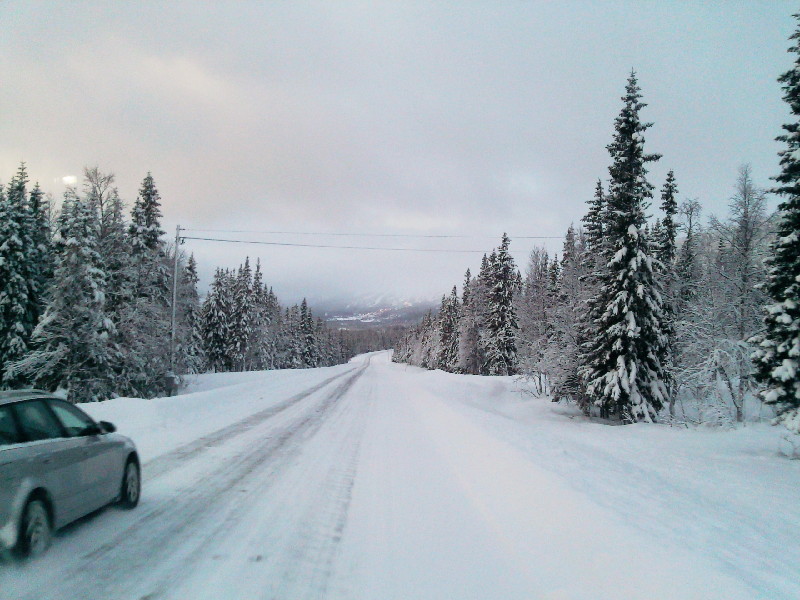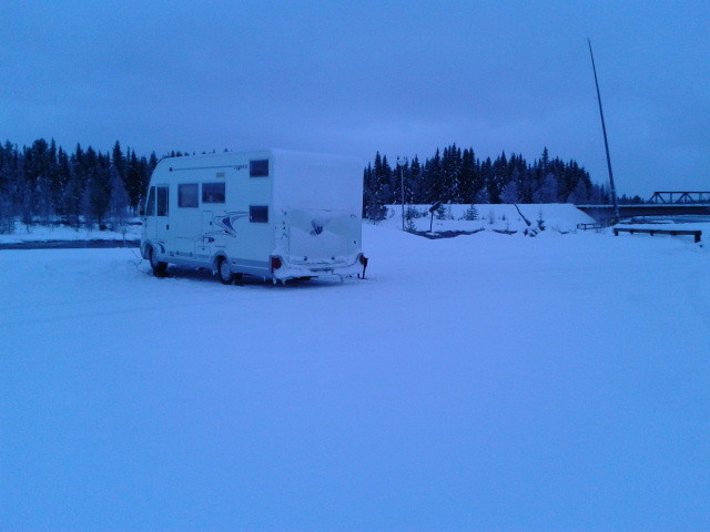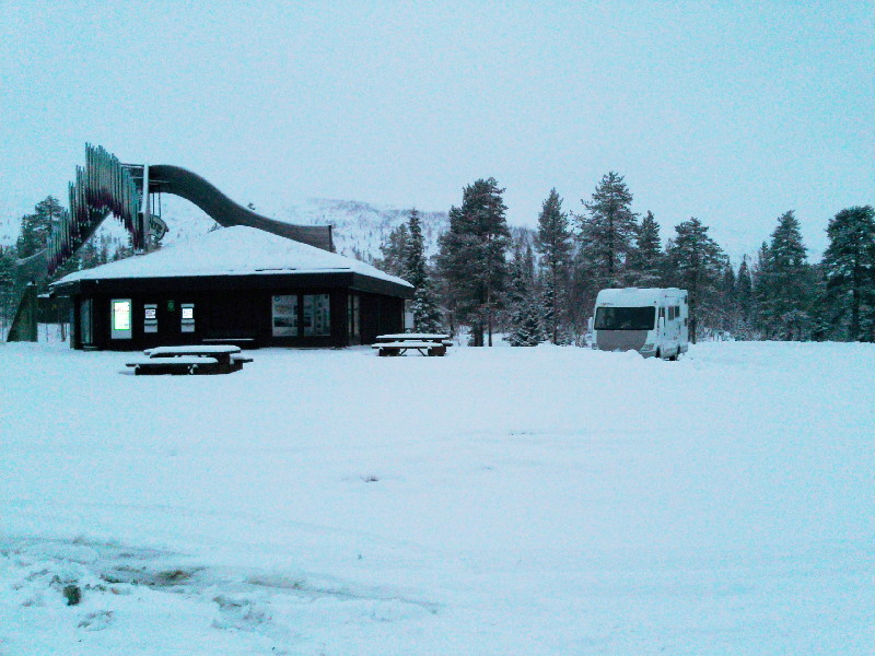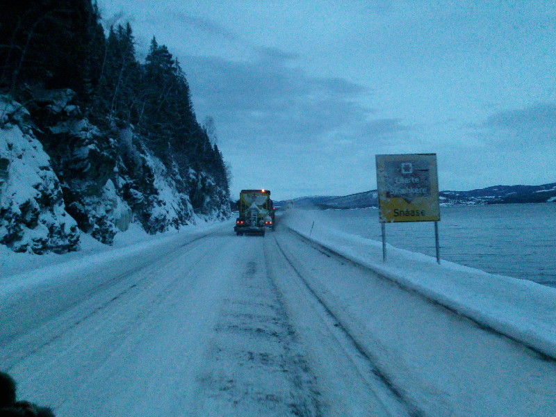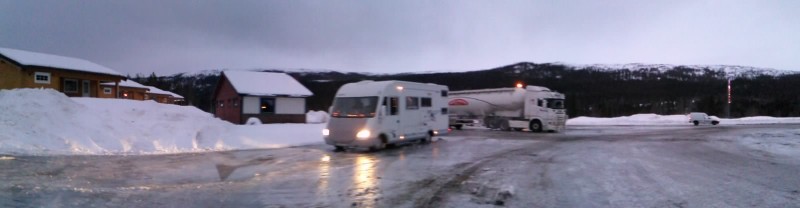 Bin gespannt, denn das ist noch zu wenig :wink: na denn mal los!!!! Bin gespannt! Auch auf den schwedischen Teil, wäre auch mal eine Variante. Südschweden ist uns nämlich (landschaftlich) zu langweilig... :roll: Also ich bin bereit. Es kann losgehen... Eigentlich hatte ich auf dem smartphone einen OSM-routentracker mitlaufen lassen, das hat auch gut funktioniert mit der touraufzeichnung, ich konnte die route mit dem vielen seitlichen abstechern auf der OSM-karte auf dem smartphone sehen aber habe es bis jetzt noch nicht geschafft, die aufgezeichnete route in den pc hochzuladen und sichtbar zu machen. Vielleicht kann ja einer von den GPS-experten mal helfen oder hat eine ander gps-tracking-app, welche die route bei googlemaps aufzeichnet, denn die OSM-karte scheint mir für Skandinavien nicht so optimal zu sein. Geplant war unsere abfahrt für freitagvormittag den 28.12.12, aber Annett mußte noch einen tag länger arbeiten, weil die vertretung erst am samstag beginnen kann und außerdem war am donnerstag und freitag ein fürchterlicher wintersturm in Mittelnorwegen, welcher mich zweifeln läßt ob wir überhaupt losfahren. In der nacht zum samstag stürmte es noch einigemal ordentlich mit in Norwegen sogenannten "Hauswacklern" und unsere Vicky hat sich unterm schreibtisch verkrochen. Am kücherfenster sieht das so aus. ![]() Aber :D am samstag früh war alles ruhig und 2 cm neuschnee haben alles wieder frisch und sauber winterlich verzaubert. Kurz vor 10.00 uhr sind wir abfahrbereit und es sieht so aus. ![]() Samstagvormittag ist üblicherweise noch wenig verkehr, aber der winterdienst auf dem Fv 705 in Selbu ist schon im einsatz. ![]() Unser erster stop ist wie üblich an der Statoil-tankstelle mit dem Selbutroll, ![]() um das erste mal unsere neuen Statoil-kaffee-abo-tassen für 2013 mit dem heutigen frühstückskaffee zu füllen. ![]() Mit frischem superheißem kaffee fahren wir dann weiter den Fv 705 nordwärts und am Selbu-skicenter ist die strasse noch schön winterlich aber sauglatt. ![]() Je näher wir aber dem Trondheimsfjord kommen um so weniger winterlich sieht es aus und nördlich von Stjørdal ist die E 6 voller schneematsch und einigemal bekommen wir vom gegenverkehr der schmutzigen schneematsch vor die motorhabe und windschutzscheibe gespritzt. ![]() Aber mit jedem kilometer weiter nördlich wird es mehr und mehr winterlich. ![]() ![]() Nördlich von Steinkjer wird dann auch auf der E 6 kein salz mehr gestreut und der winterdienst im wochenendmodus hat den neuschnee der letzten nacht noch nicht von der fahrbahr geschleudert. ![]() Aber der räumdienst kommt uns entgegen und um die mittagszeit machen wir hier eine kurze rast. ![]() Annett spielt mit dem hund im schnee und ich suche im autoradio einen gescheiten sender, welcher wintersport und besonders "Tour de Ski" live sendet. Mein gedanke, den winterdienst dann in nördliche richtung abzuwarten geht auf und gleich nachdem der winterdienst vorbei ist fahren wir auch wieder los - aber diesmal hinterher. ![]() Im autoradio hören wir die langlaufrennen der frauen und männer von der Tour de Ski und das skispringen der Vier-Schanzen-Turnee. Es wird immer mehr winterlich und ganz allmählich dunkel. ![]() ![]() Einige kilometer nördlich von Majavatn, wo der Rv 76 von Brønnesund kommend auf die E 6 stößt, kommen wir das erste mal auf die route des Sagavegen, welcher quer durch Skandinavien von der Helgelandsküste in Norwegen zur schwedischen Ostseeküste verläuft. In Trofors verlassen wir die E 6, dem Sagavegen weiterhin auf dem Rv 73 in richtung Hattfjelldal folgend, unserem heutigen tagesziel. Wir haben wieder glück und der winterdienst fährt vor uns. ![]() Wir erreichen Hattfjelldal ![]() und finden einen übernachtungsplatz mitten im ortszentrum gegenüber der kirche. ![]() Die außentemperaturen liegen um die 0°C und mal regnet es oder es ist nasser schnee - also von der ansicht schön winterlich aber von den temperaturen nicht so ideal. Die übernachtung in Hattfjelldal ist angenehm ruhig bis dann am nächsten morgen ab 5.30 uhr :!: :eek: - es ist sonntag :!: das "Konzert des norwegischen Winterdienstes" beginnt. Das konzert beginnt mit der "Ouvertüre der LKW-schneepflüge", weil es noch dunkel ist mit jede menge discolichtshow, im 5-minutentakt kommen die schneepflüge auf der hauptstraße ungefähr 50 m von uns entfernt vorbeigerauscht und drehen jedesmal einige ehrenrunden im nahen kreisverkehr bevor sie weiterfahren. Bei tageslicht sieht das ungefähr so aus. ![]() Nach einer kurzen konzertpause beginnt dann um 6.30 uhr die "Sinfonie des Kommunalen Winterdienstes von Hattfjelldal", natürlich auch wieder mit einsprechendem discolichtshow, nicht in so einem hohen tempo wie die lkw-schneepflüge daher aber in wesentlich kürzeren zeittakt werden die kommunalen wege, straßen und gehwege im ortszentrum von Hattfjelldal geräumt. Den schluß des winterdienstkonzertes leiten ein radlader mit einer riesigen schneeschaufel und ein traktor mit schneefräse ein, natürlich auch mit discolichtshow, welche im ortszentrum sämtliche parkplätze vor den geschäften, firmen, bank, post, hotel, rathaus, kirche und natürlich auch vor und neben dem Womo räumen und den neuschnee der letzten nacht auf die schon vorhandenen schneeberge schieben und fräsen. Um 7.30 uhr ist das sonntagsmorgen-winterdienst-konzert dann erfolgreich beendet und ich könnte ohne weiteres mit halbschuhen aussteigen ohne im tiefschnee zu stehen und nasse strümpfe zu bekommen. Es sind ca. -2°C, nicht mehr so naßkalt und eine wunderbar klare luft als ich gegen 8.00 mit dem hund die morgenrunde mache. ![]() ![]() Gegen 8.30 uhr, nach morgenroutine und frühstück, ist es immer noch nicht hell, aber wir fahren trotzdem los in den tag hinein. Auf der weiteren tour verlassen wir wieder den Sagavegen und folgen dem Rv 73 über das Krutfjell, ![]() es wird langsam heller ![]() ![]() ![]() unterwegs finden wir noch dieses wunderbar weihnachtlich gesch