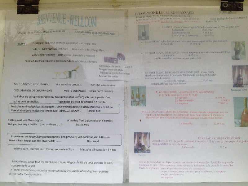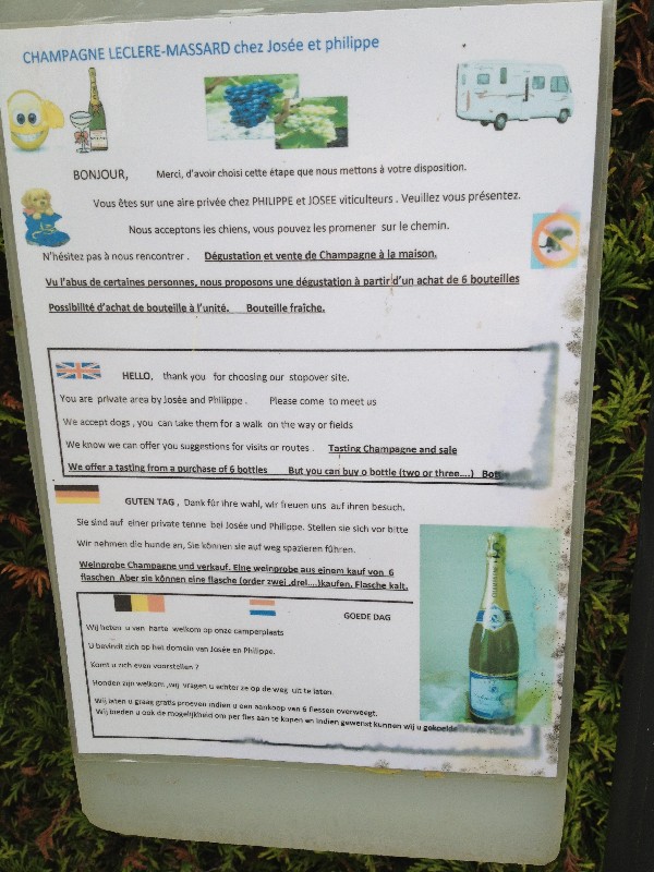 F-51 Villeneuve-Renneville-Chevigny, 12 Rue du Plessis - Stellplatz bei einem Champagner-Winzer im Ortsteil Chevigny, der Stellplatz neben dem Wohnhaus ist aber nicht in den Reben - vorhanden sind VE (Grauwasser über Bodeneinlass, WC getrennter Einlass, getrennte Wasseranschlüsse/Schläuche für Toilette/Frischwasser) - Strom und Wifi gegen Gebühr - sehr ruhig, von der nächsten Durchfahrtsstrasse weit entfernt, daher aber auch nichts los - ca. 10 Minuten zu Fuss gibt es 2 Restaurants/Essensmöglichkeiten (haben wir weder getestet, noch genauer angeschaut) - Stellplatz ist offiziell mit Womo-Schild gut ausgeschildert, aber auch bei France-Passion - 5 € pro Nacht, Strom 2€, Wifi 3€, mit France-Passion oder Champagnerkauf entfällt die Stellplatzgebühr für eine Nacht - Dechetterie (Entsorgung für Plastik/Glas/Papier) an beiden Zufahrten zur Rue du Plessis vorhanden - --> Link ![]() ![]() ![]() ![]() ![]() ![]() ![]() ![]() ![]() |