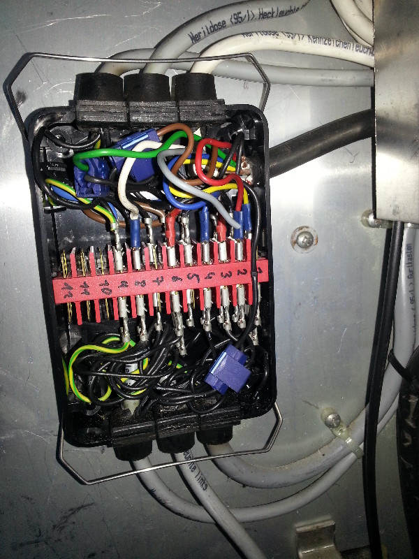 Die schalten das Mulimeter auf Durchgang und halten ein Ende des Kabels an deine Masseverbindung der Lampe und das andere Ende einfach auf den Kugelkopf der AHK -> sollte jetzt nichts piepen fehlt Masse und ich kann wetten das da nichts piept :wink: Schade das ich erst ab Februar(wahrscheinlich) bei Dir in der Ecke bin -> Wir hättens garantiert gefunden ..... Das Kabel von Klemme 1 ist gequetscht ! Moin roomer wenn ich mir das Bild mit der Verteilerdose ansehe und die Kabelbanditen sehe wird mir :ooo:übel Hab beruflich auch mit diesen Dingern zun tun die leider oft zu einer Fehlerquelle führen. Bei einem meiner bisherigen Wonis befand sich unter dem Fahrzeug ein Kabelstrang mit einer Steckerleiste für die Heckbeleuchtung,ähnlich wie bei einem Anhänger,der vergammelt war!Teil erneuert und gut wars. Drück dir beide Daumen. Gutes gelingen Heinz Tach Roomer, so wie ich lese bist du noch nicht weitergekommen und wie schon geschrieben wurde: "Messergebnisse muß man deuten können" Ich würde wie folgt weitersuchen: In der Verteilerdose die Steckverbindungen von dem ankommenden Kabel einzeln abziehen, den Blinker dabei eingeschaltet lassen und hoffen das wenn irgendein Kabel gezogen wird dieser richtig blinkt und dann das Kabel zum Übeltäter verfolgen. Achtung hierbei keine Stecker aneinanderkommen lassen , Kurzschlußgefahr. Es geht natürlich auch alle ankommenden Steckverbindungen zu lösen, dann wüßten wir ob der Fehler VOR oder HINTER der V-Dose liegt. Hierbei aber die Kabel sorgfälltig beschriften damit du diese wieder an ihren Platz anbringen kannst. Viel Erfolg :) Kai