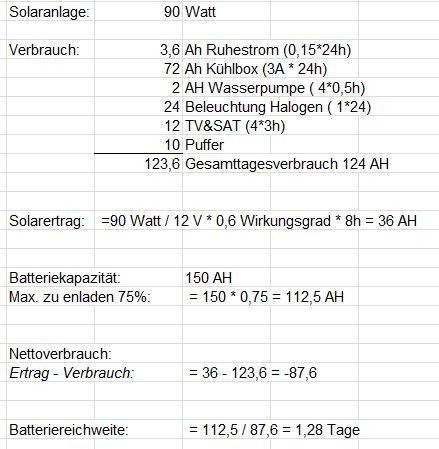 Schau doch mal die folgende Tabelle an: reisemobilist.de/dow/DL-PV-An-Wohnm-Berechnung.xls Damit lässt sich sehr schön rechnen.