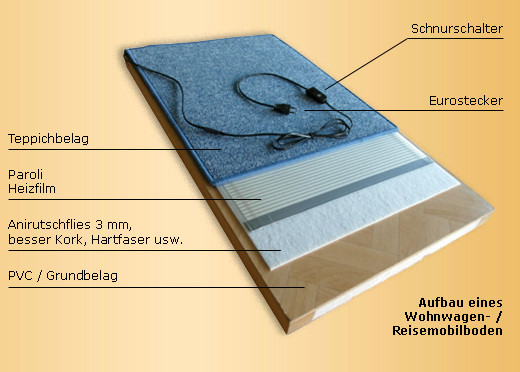 Ist ja schön das man da drinn barfuß laufen kann. Aber schlafen könnte ich da drinn nicht mehr,der Gedanke an die hohen Raten würde mir immer den Schlaf rauben :wink: Dieter Teppiche haben das Problem, dass sie schlechter zu reinigen sind und wenn man Nässe mit herein tägt, sich auf alle fälle arg ärgert. Ich nutze für ähnliche Belage Neopren, (Daraus werden Tauchanzüge gemacht) es ist ein Gummischaum (oder so ähnlich). Das Isoliert sehr gut (ich gehe mit einem solchen Anzug unter Eis Tauchen. ABER es produziert keine Wärme, ist somit nur Isolator und keine Wärmequelle. Nun gibt es für ganz Verfrorene unter uns Heizsocken, dass sind Socken die eine kl elektrische Heizung eingebaut haben und über eine Batterie betrieben werden. Braucht man auch beim Tauchen oder Skifahren. wir haben 80%igen strohrum im womo, das gibt lecker grog und die füsse sind gleich warm. |