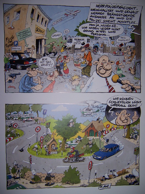8) Das war ein Auftragsklau bestimmt! Ich schlaf auch gern aus und hab mal neben so einem Ding gewohnt. :mrgreen: Das mit den Kat's, das ist eine miese üble Sache. Für solche Brüder sollte man die Scharia hier einführen. Von meinem Betriebshof fliegen sie regelmäßig und auch bei uns zuhaus mußten wir schon sehr rabiat werden, da wir durch Umbau und Betrieb meines Sohnes oft Container stehen haben. Danke Wolfgang. Sachen gibts :nein: Alles doch nur Kleinigkeiten, darüber machen die Verantwortlichen doch Witze. Viel wichtiger, und dazu brauchen wir jeden Mann: "Wer hat die blaue Tasche da auf den Bahnsteig mittenhin gestellt? Wir haben noch ein halbes Jahr Zeit das rauszufinden, dann werden wir andere Seiten aufziehen müssen." :D :lach: :lach: In eine m alten Moppedkalender habe ich eine Karrikatur von Holger Aue gefunden, die unsere Probleme von vor 10 Jahren darstellt. Ist nicht sonderlich gelungen, die Aufnahme,mein Scanner ist nur A4, aber das passt dann wieder zur Situation in unserem Land. Ich hoffe, Holger nimmt es nicht übel und der Motomania- Verlag lässt sich hier mal als Quelle "missbrauchen". Albert