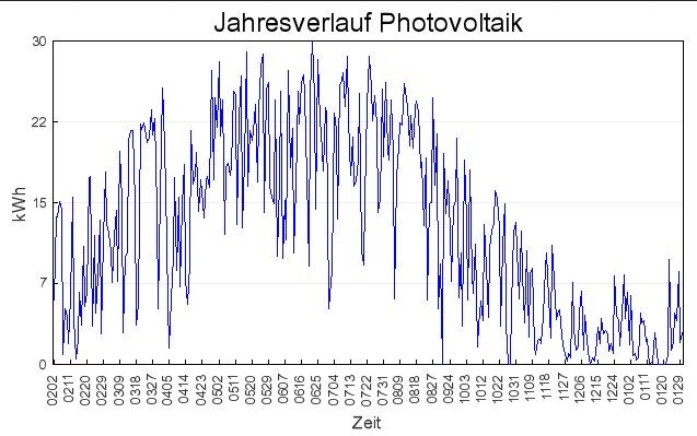 Zur Info: (Kurve vom 1.2.2012 bis 1.2.2013) Hier seht die die Jahresertragskurve einer guten (*) 4,7kWp Dachanlage mit 30° Dachneigung, die nicht exakt gen Süden ausgerichtet ist und daher nur 94% des Maximums ernten kann (meine kleinere Dachanlage) . Jahresertrag 2012 waren 4576kWh. Ich denke man kann es gut verwenden um zu kalkulieren, was machbar ist und was Märchenstunde ist. Eine Anlage mit flach liegenden Zellen auf dem Dach bringt im Winter nur selten wirklich guten Ertrag.