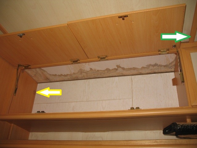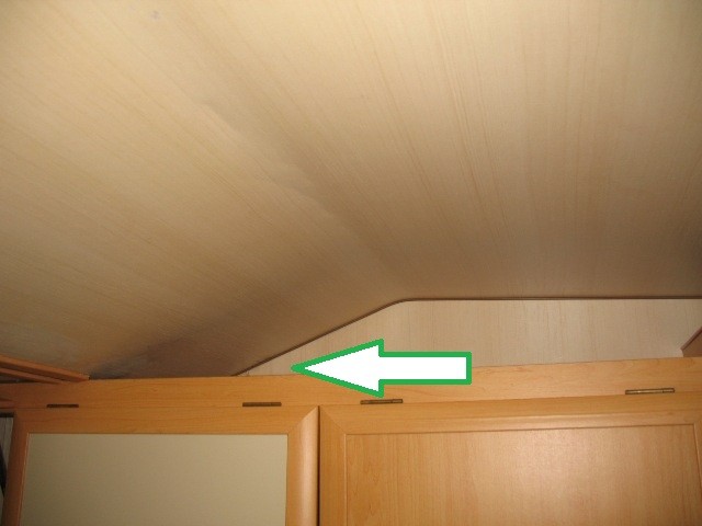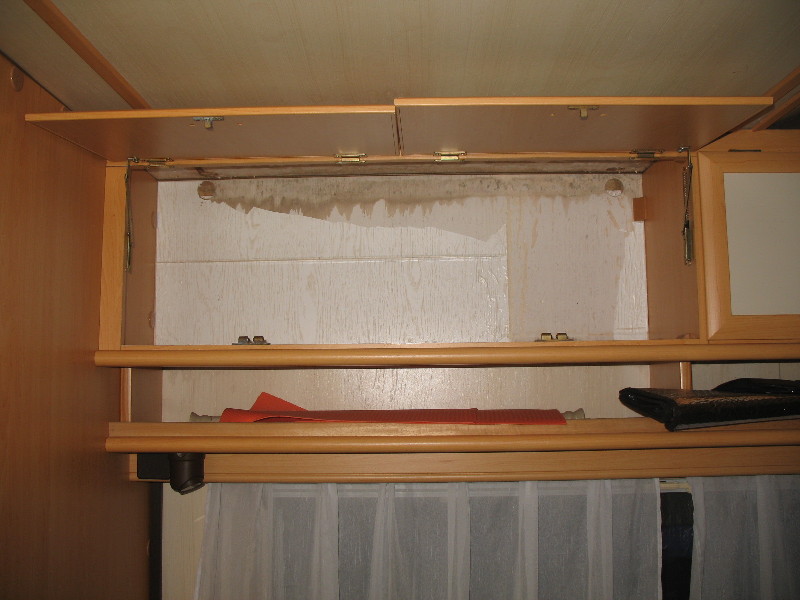 Letzte Frage für heute. Im Oberschrank Fahrerseite war Dekorfolie eingeklebt. Die hat sich nun aufgeworfen und gewölbt. Habe sie abgezogen und fette Wasserränder kamen zum Vorschein. Das Sperrholz fühlt sich nicht naß an und ist nicht aufgequollen. Nebenan im Bad nix an der Decke, davor der Buckel zum Alkoven auch nix. Also nur partiell in diesem Schrankbereich. --> Hier auch ausbauen und kontrollieren? Ich gehe davon aus, dass das Rahmenholz zum Dach, wie es wie im Bad auch ist, ok ist. Warum? Weil sich, wenn öfter Wasser eingetreten sein sollte, das Wasser nach unten den Weg sucht und nicht oben Fäulnis erzeugt? Und weil ich hoffe, dass es so ist.... :? Gegenüber in den Schränken sind nur ein paar alte Ränder.