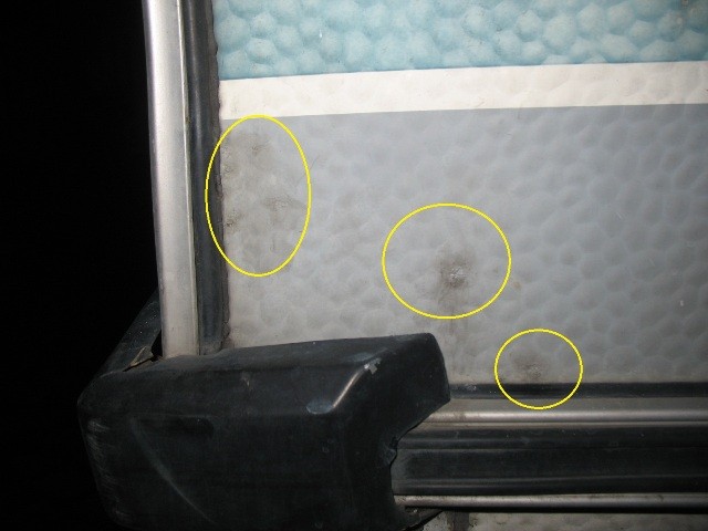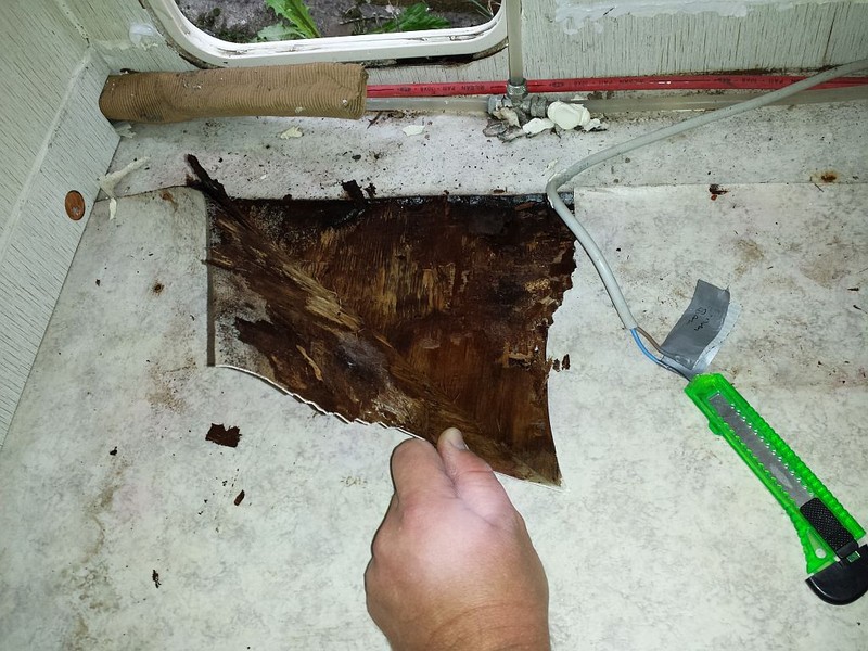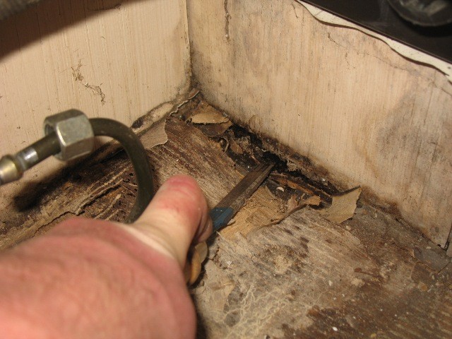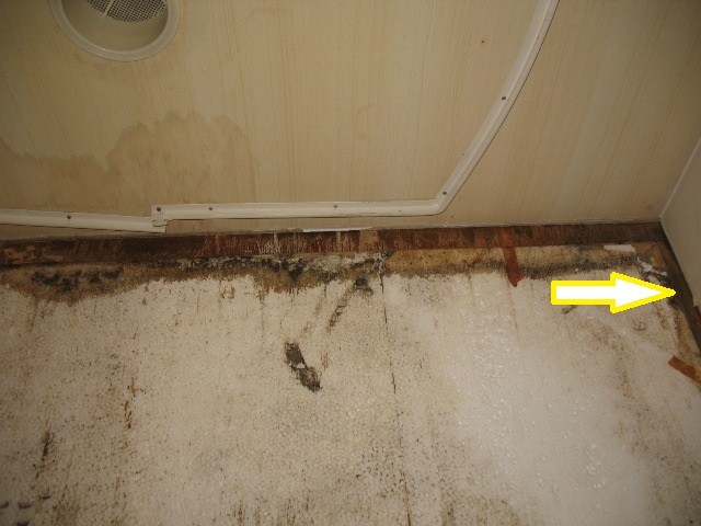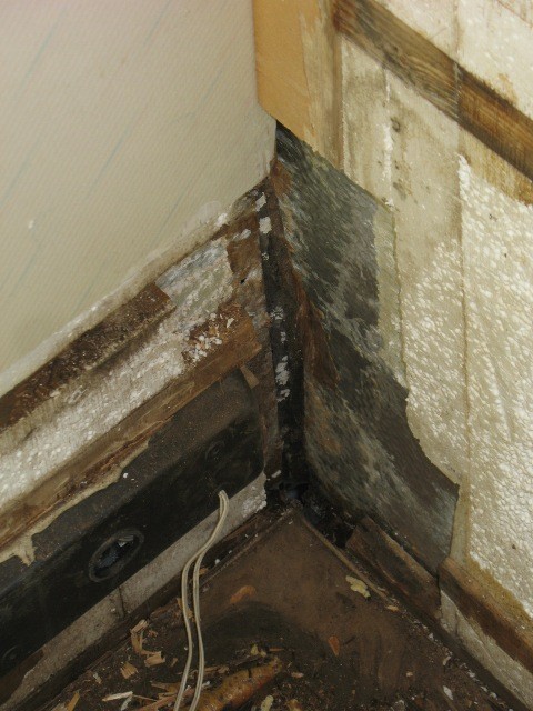 Jetzt aber zu meiner Sorge ... der Statik. Vielleicht ist es ja auch garkein Problem. Nachdem die komplette Innenverkleidung der von oben nassen Wand und die Duschwanne raus ist, stellte ich fest, dass die gesamte Ecke des Wohnmobils, Rücklichtbereich, nass ist. Fahrerseits hinten ist genau das Holz in den Ecken weggefault (ca. 15 cm senkrecht und 25 cm waagerecht). Eine waagerecht zwischen Boden und Heckwand eingebaute Holzleiste (Foto Unterseite, wo Finger drückt) ist von der Ecke bis ca. Kennzeichenleuchte komplett nach innen durchnässt. Drücken mit der Hand gegen die Heckwand im Bad zeigte: die Rückwand ist unten in dem Bereich zur Bodenplatte nicht mehr fest. Die andere Fahrzeugecke, in der der Boiler steht, sieht augenscheinlich besser aus, ist aber auch nass. Da muss ich anschließend ran. Von unten sieht man, dass beidseits die Ecken nass sind und es keinen Schutz der Fuge zwischen Boden und Wand gibt, keine Abdeckung nichts! Ist das denn normal?!?! Das Spritzwasser kann ungehindert dort hineinziehen. :eek: Und ich hatte das Fahrzeug vorm Winter erst zur Unterbodenkonservierung, da genau das nicht passieren sollte - war wohl eine zu frühe Geldausgabe. :(