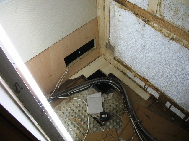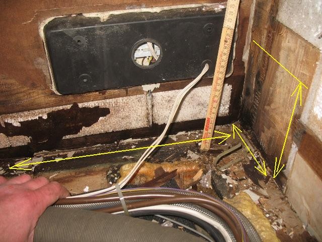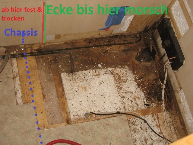 Nachfolgend ein kleines Update zur weiteren Suche nach Feuchgebiet. Ecke Heck Beifahrer --> Möbel ausgebaut, Trumaboiler ausgebaut --> Kleiderschrank soll drin bleiben >> Seitenwand Richtung Beifahrer ca. 70 cm morsches Rahmenholz und Boden >> ab Bereich wo auf Chassis aufliegt festes Holz >> Heckwand erreicht erst im Kleiderschrank trocknes und festes Holz