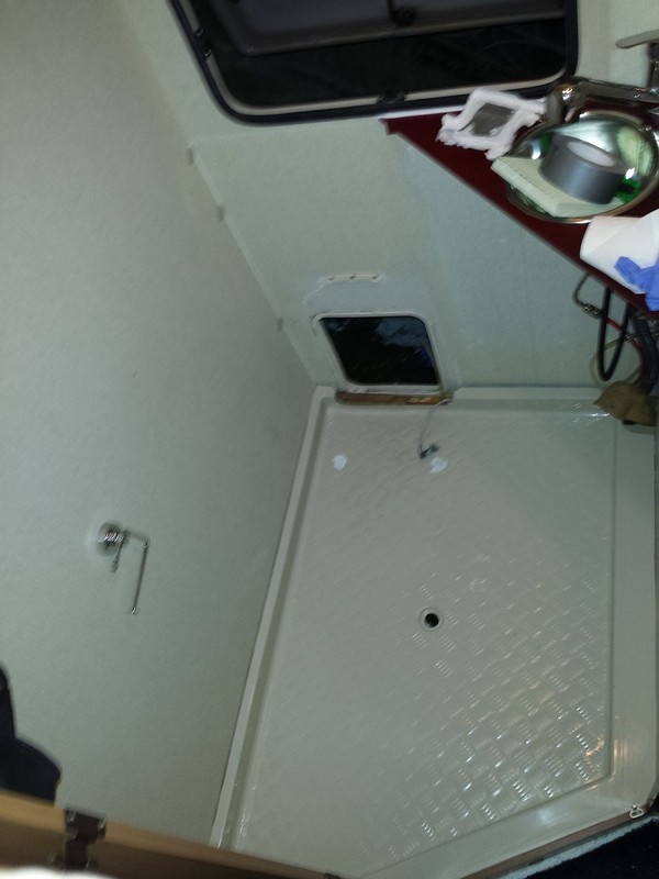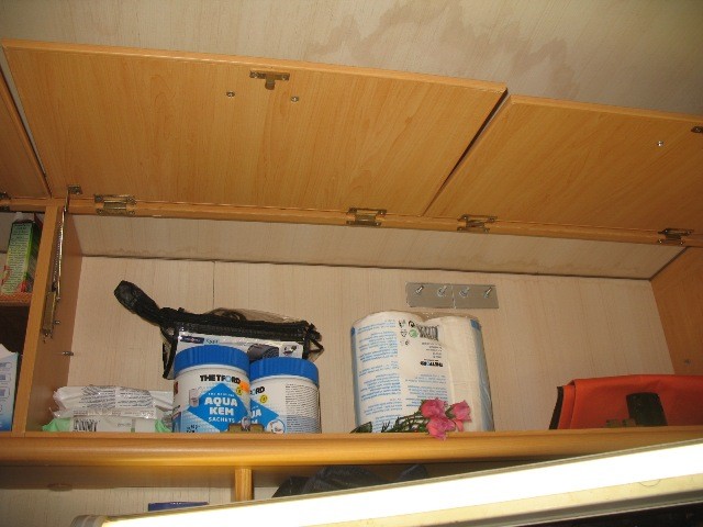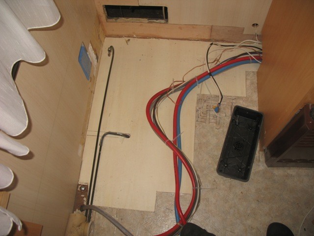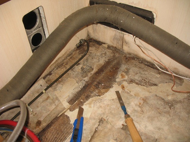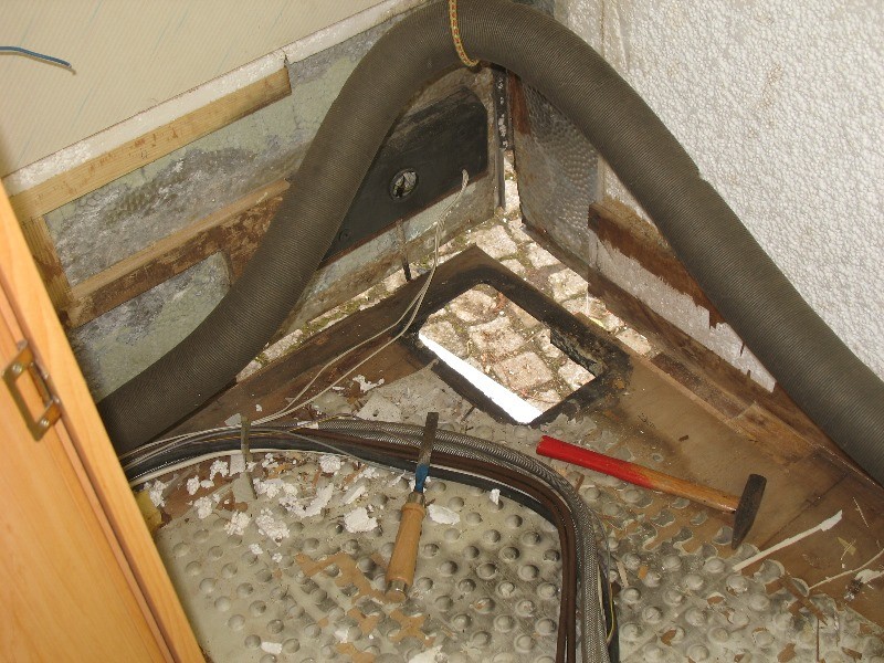 Jetzt lief also immer gerne mal Wasser beim Händewaschen oder so durch das zweite, nun offen stehende Loch, in den Waschbeckenunterschrank (oder wie sich das Ding dort nennt), und von dort aus über die Verkleidung (eckig, in der Badecke) auf den Boden. Dies sei kein Problem, so versicherte es mir der Vorbesitzer, weil das Wasser direkt nach unten aussen abfliessen würde. In der Praxis hat das Mobil da aber kein Entwässerungsloch, sondern nur Boden -> Wasser auf dem Boden unter der Duschwanne.
