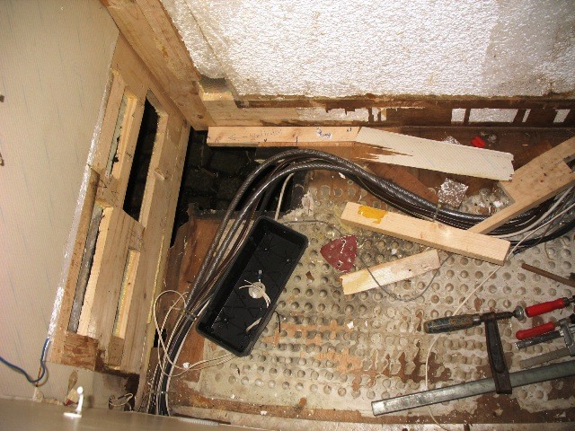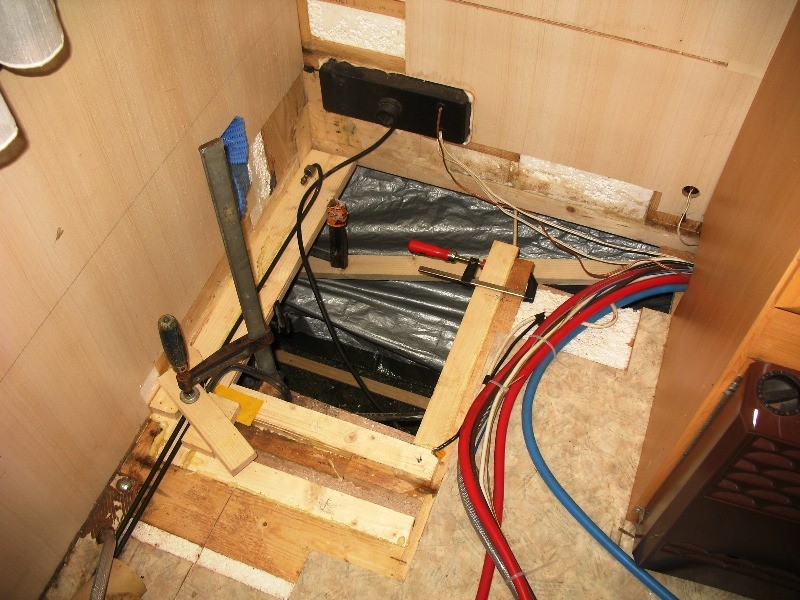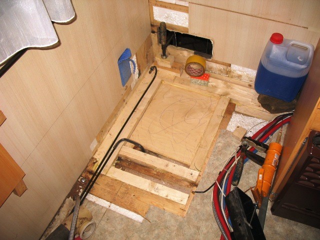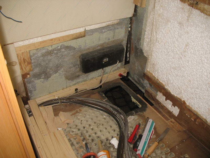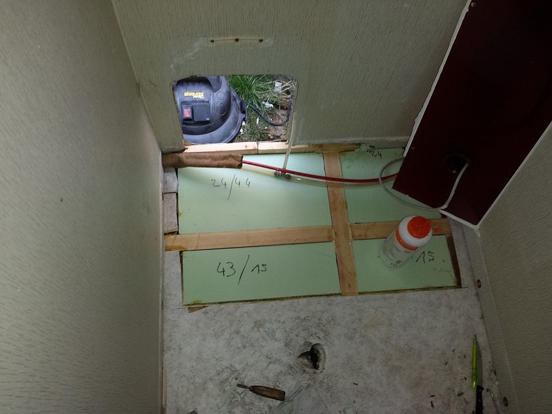 Also Boden raus bis der Torf zuende war, 4 Heizlüfter über Nacht reingestellt, alles sauber rechteckig in 45° abgesägt damit die Lasten auch wieder auf den Rahmen übertragen werden können, neues Lattengerüst, 9mm Siebdruckplatte unten, 20mm Styrodur, 8mm wasserfestes Sperrholz oben drauf, alles zusammen zu einer Einheit mit Fermacell-PU Leim verschäumt, womit man auch gleichzeitig alle Kältebrücken erledigt, neues PVC drauf und gestern dann die Wanne wieder mit Knauf-Wannensilikon einsilikonisiert, heute die Toilette an die Wand verschraubt und ebenfalls mit dem guten Knauf-Silikon Verfugt, morgen dann das Acrylgedönse wieder reinbasteln und Donnerstag Nacht geht´s ab, 13 Monate Meisterschule.