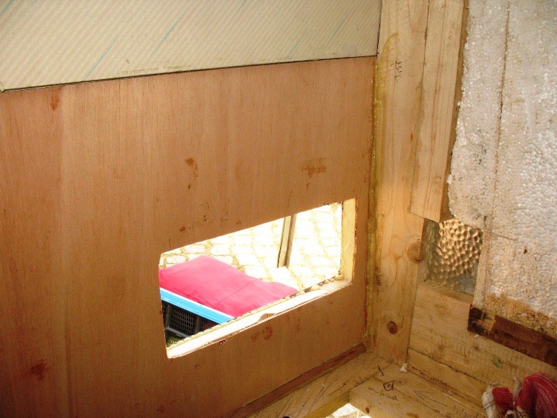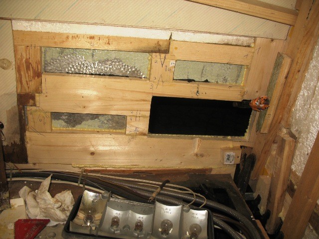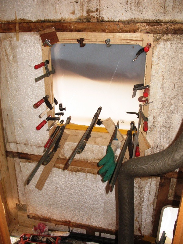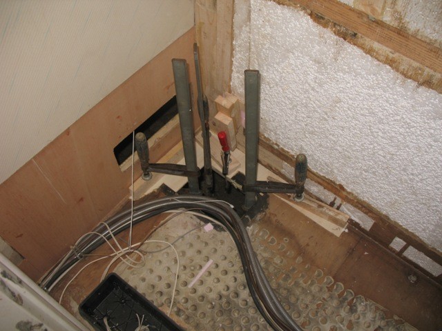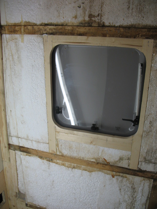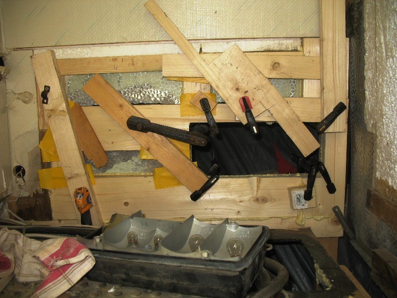 Den Rahmen um die Entsorgungstüre habe ich aus der Wand gepult, innen in etwa 8cm als das Holz wieder gut wurde mit einer flexiblen Japansäge schräg in 45° abgesägt, das ebenfalls feuchte Styropor durch Styrodur ersetzt und eine neue Latte ebenso in 45° mit viel Fermacell-PU eingeschoben und alles per Schraubzwingen festgepresst. So habe ich das bei den 4 Latten um die Öffnung gemacht. Den Rahmen selbst wie auch die Türe in dem Klappenrahmen habe ich mit 292i eingepresst und verklebt sowie ordentlich festgeschraubt. Das ist nun ebenfalls perfekt dicht.